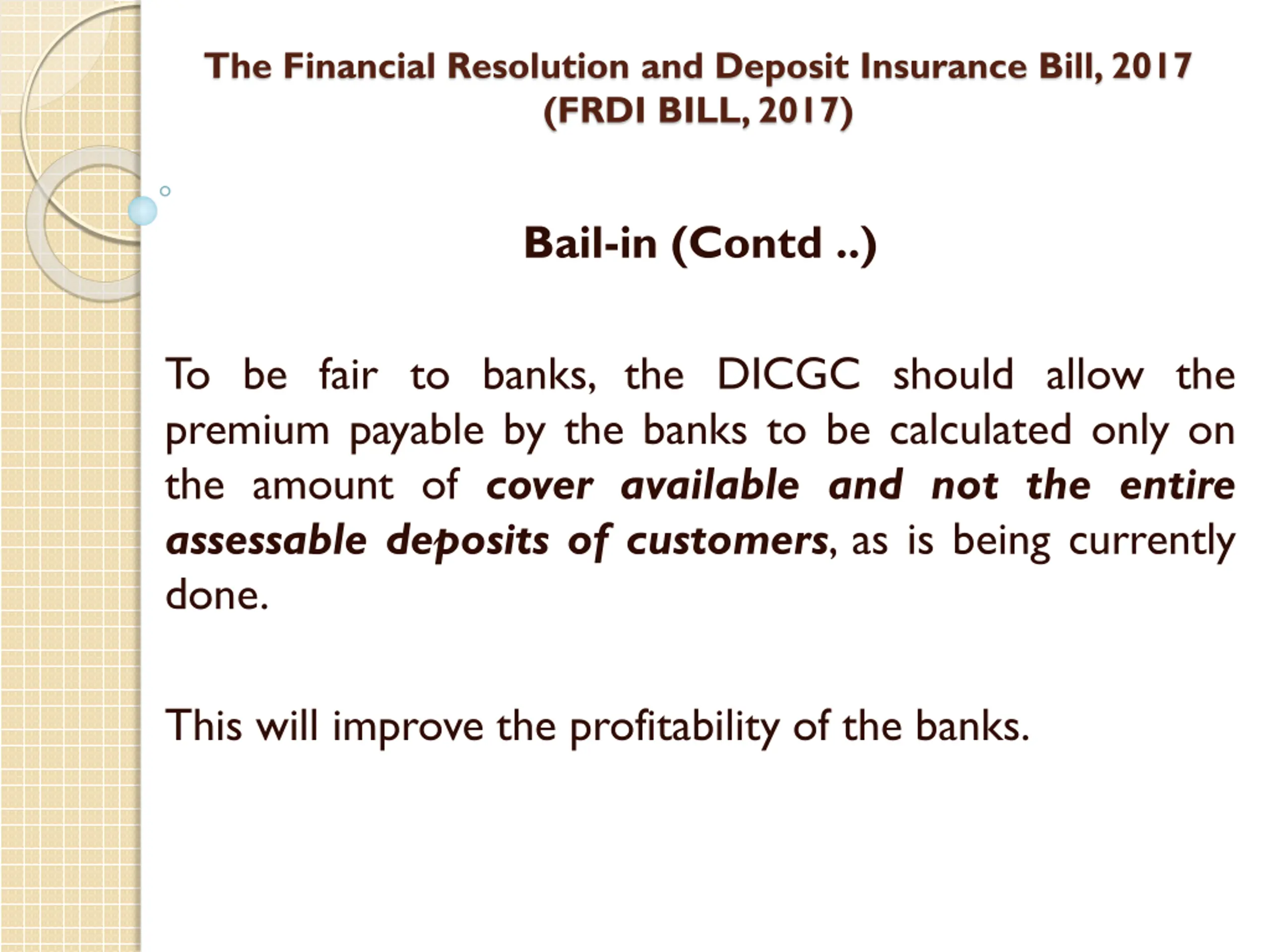 The Financial Resolution and Deposit Insurance Bill, 2017 (FRDI BILL, 2017) Bail-in (Contd ..) To be fair to banks, the DICGC should allow the premium payable by the banks to be calculated only on the amount of cover available and not the entire assessable deposits of customers, as is being currently done. This will improve the profitability of the banks.