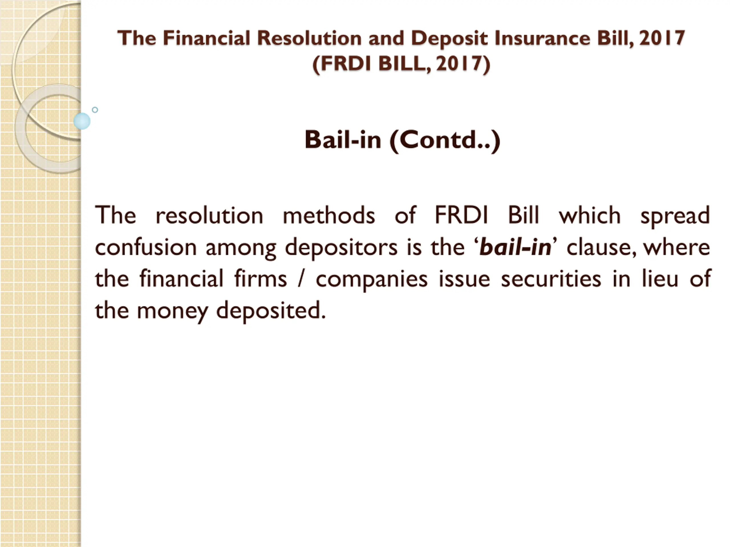 The Financial Resolution and Deposit Insurance Bill, 2017 (FRDI BILL, 2017) Bail-in (Contd..) The resolution methods of FRDI Bill which spread confusion among depositors is the bail-in clause, where the financial firms / companies issue securities in lieu of the money deposited.