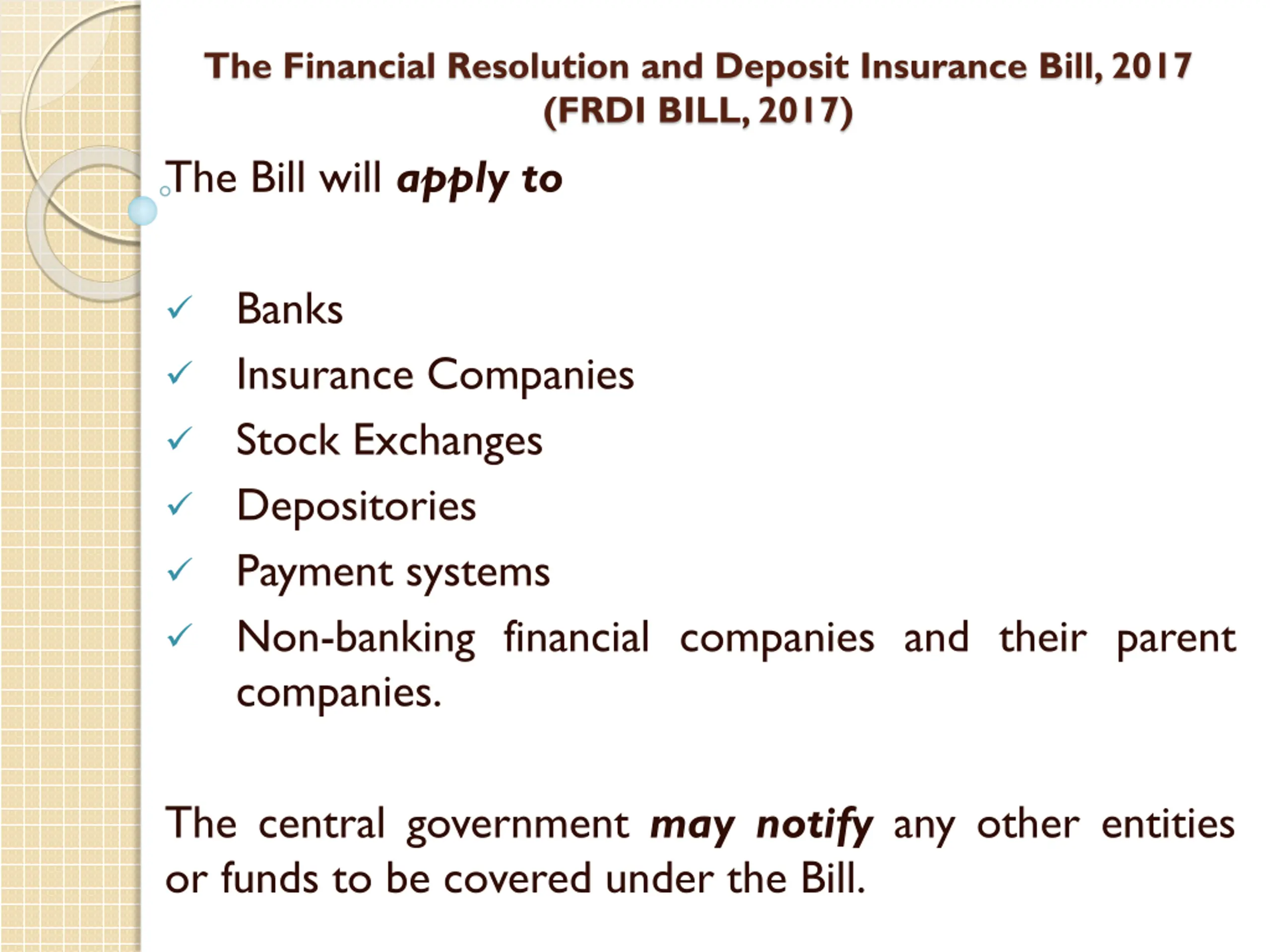 The Financial Resolution and Deposit Insurance Bill, 2017 (FRDI BILL, 2017) The Bill will apply to Banks Insurance Companies Stock Exchanges Depositories Payment systems Non-banking financial companies and their parent companies. The central government may notify any other entities or funds to be covered under the Bill.