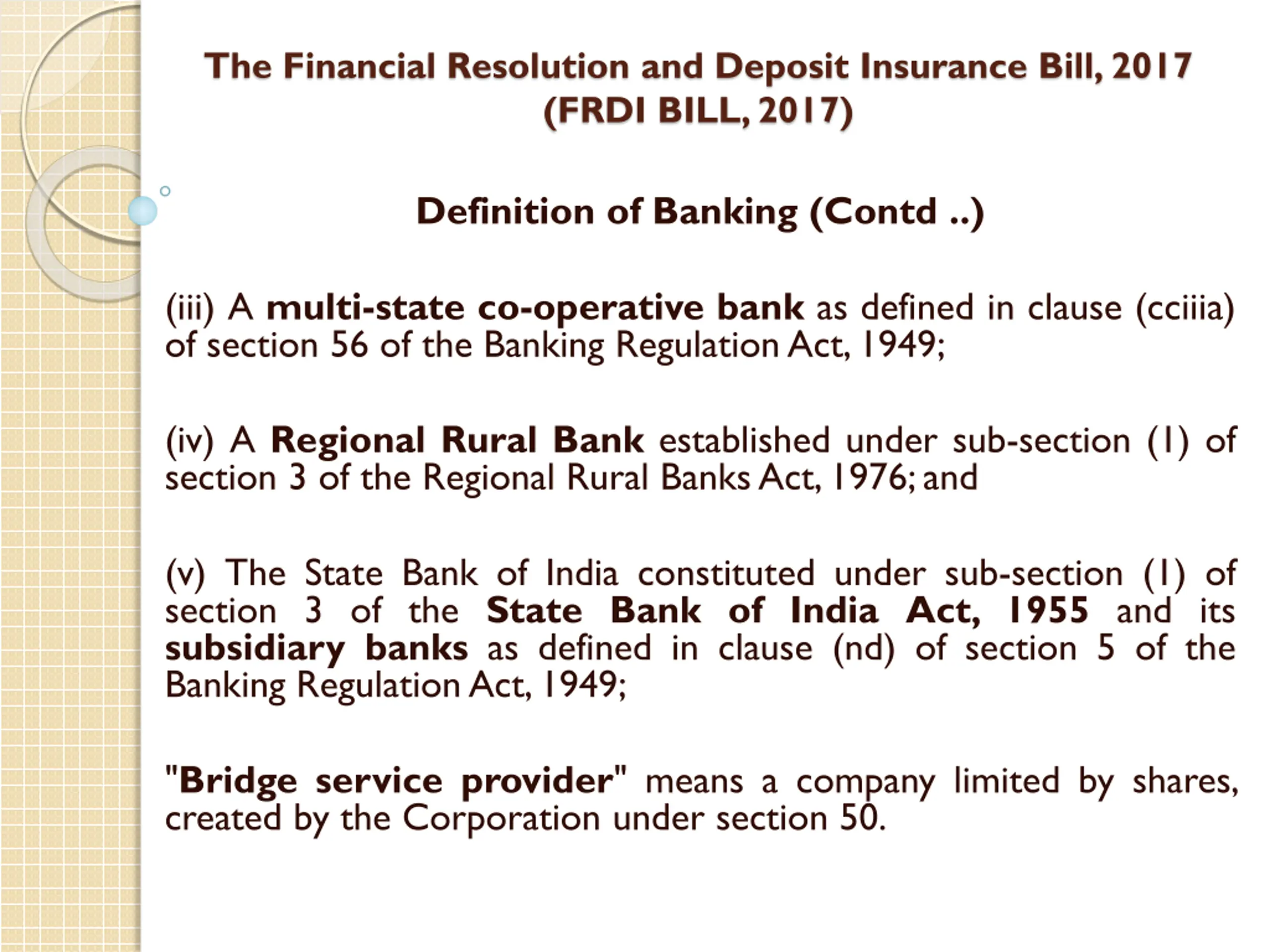 The Financial Resolution and Deposit Insurance Bill, 2017 (FRDI BILL, 2017) Definition of Banking (Contd ..) (iii) A multi-state co-operative bank as defined in clause (cciiia) of section 56 of the Banking RegulationAct,1949; (iv) A Regional Rural Bank established under sub-section (1) of section 3 of the Regional Rural BanksAct,1976;and (v) The State Bank of India constituted under sub-section (1) of section 3 of the State Bank of India Act, 1955 and its subsidiary banks as defined in clause (nd) of section 5 of the Banking RegulationAct,1949; "Bridge service provider" means a company limited by shares, created by the Corporation under section 50.
