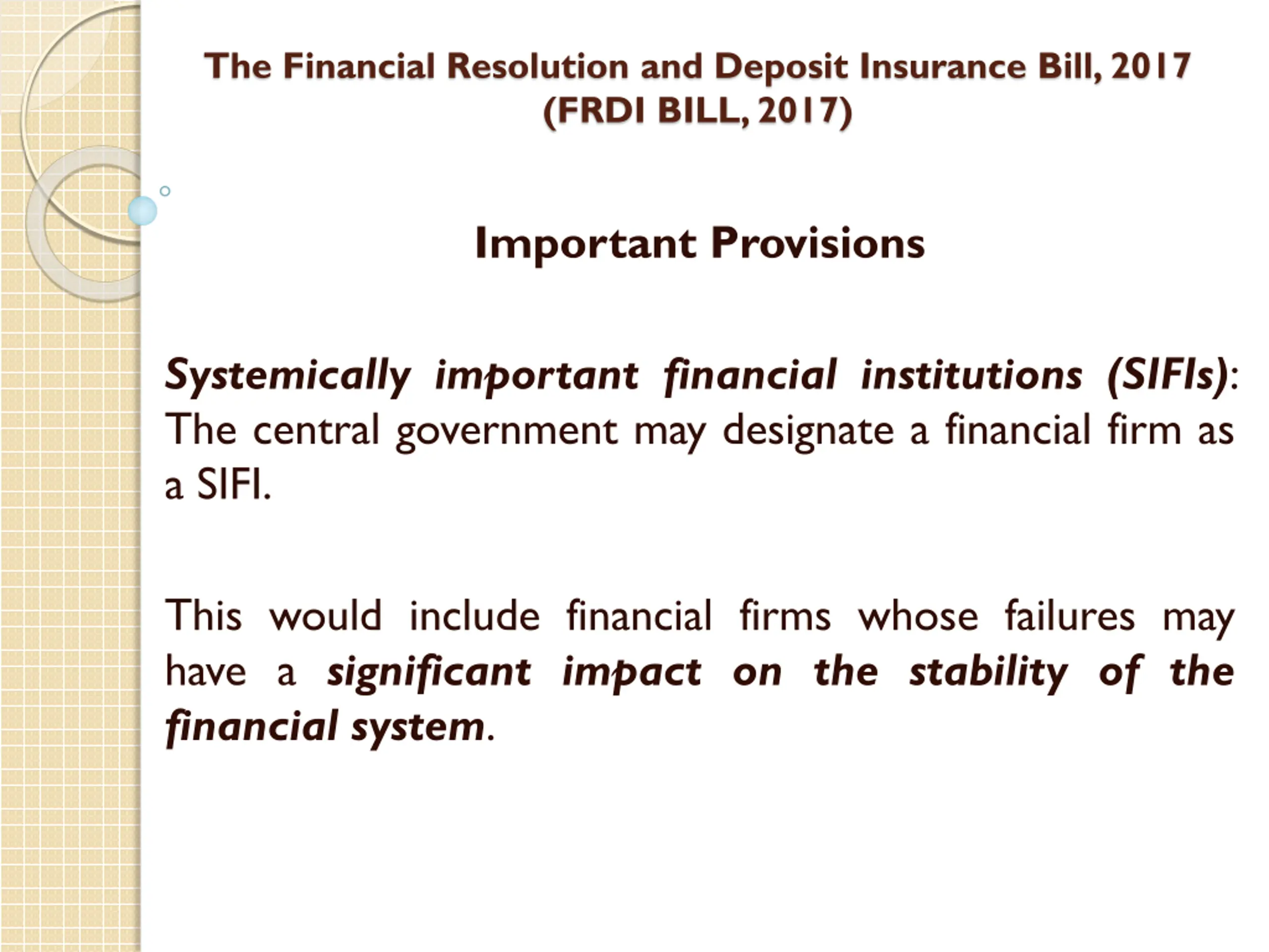 The Financial Resolution and Deposit Insurance Bill, 2017 (FRDI BILL, 2017) Important Provisions Systemically important financial institutions (SIFIs): The central government may designate a financial firm as a SIFI. This would include financial firms whose failures may have a significant impact on the stability of the financial system.