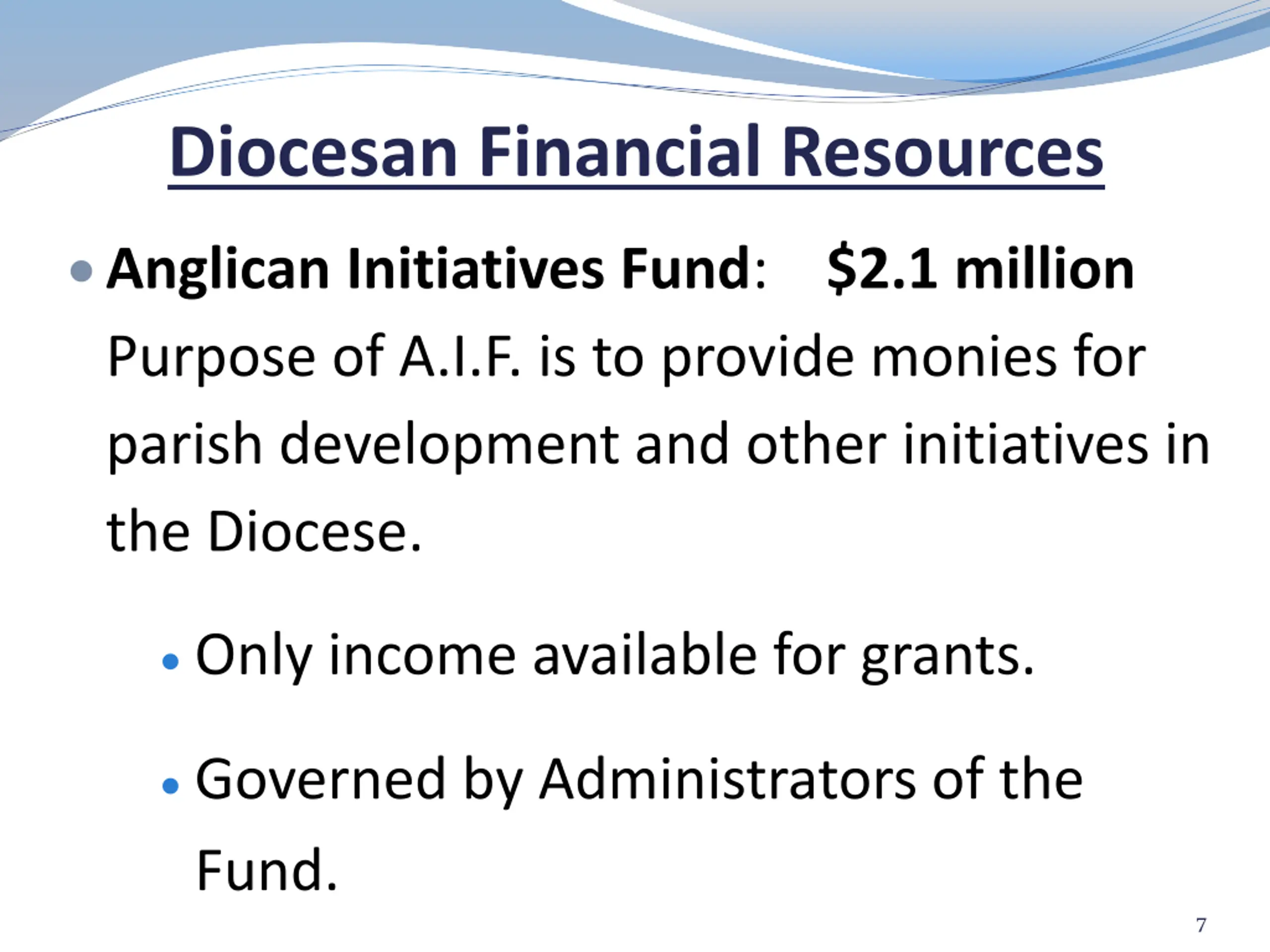 Diocesan Financial Resources Anglican Initiatives Fund: $2.1 million Purpose of A.I.F. is to provide monies for parish development and other initiatives in the Diocese. Only income available for grants. Governed by Administrators of the Fund. 7