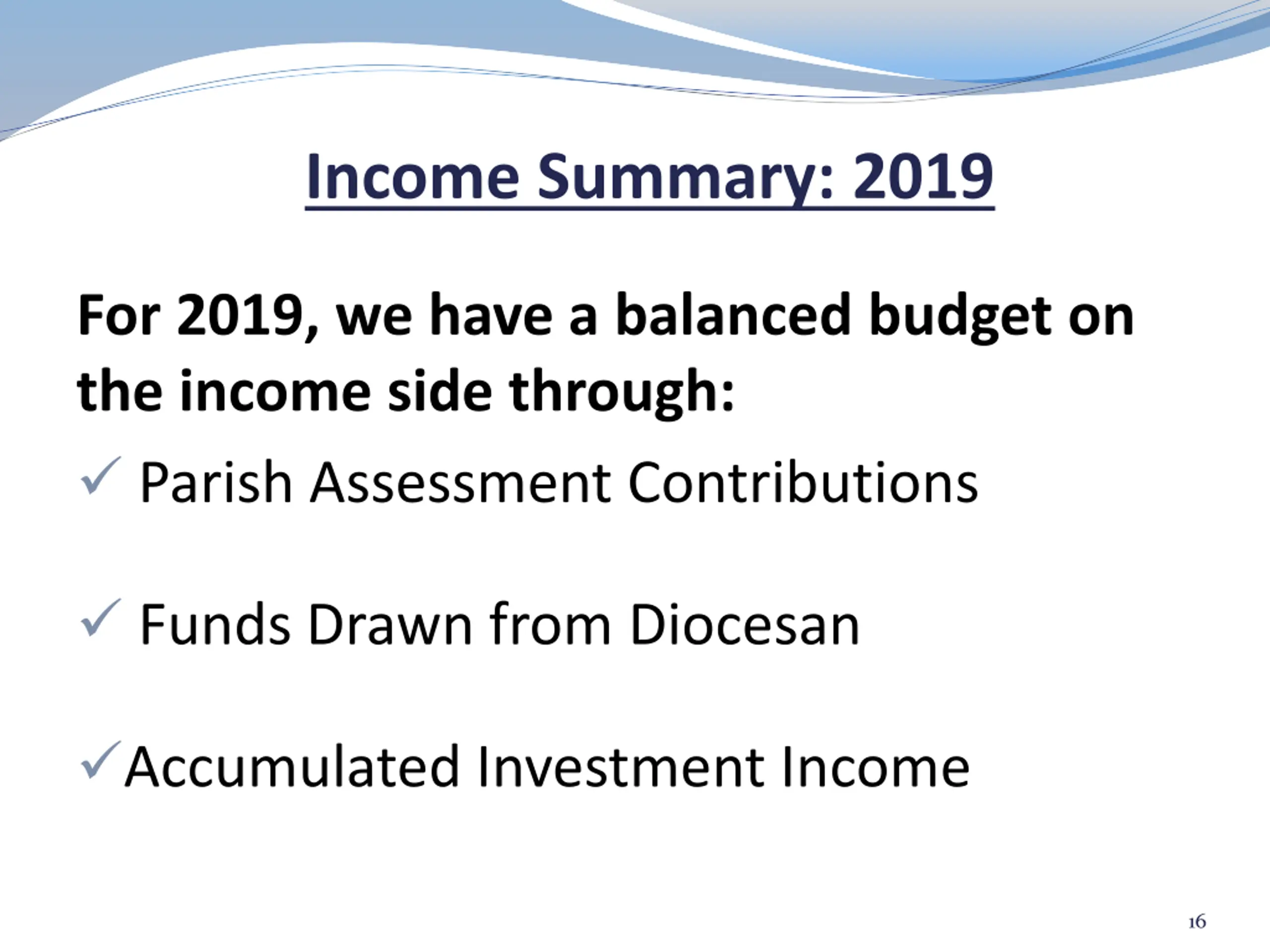 Income Summary: 2019 For 2019, we have a balanced budget on the income side through: Parish Assessment Contributions Funds Drawn from Diocesan Accumulated Investment Income 16