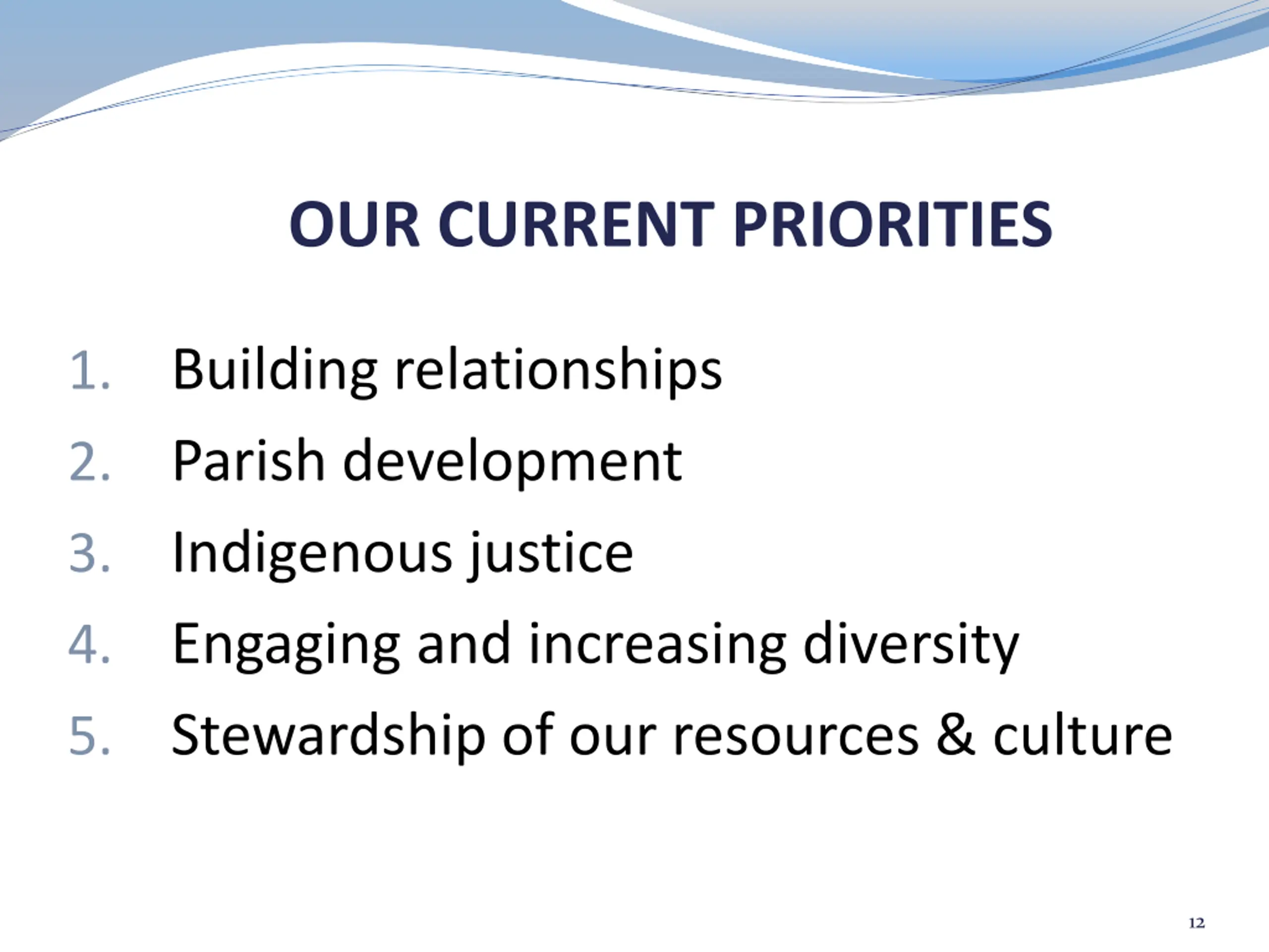 OUR CURRENT PRIORITIES Building relationships Parish development Indigenous justice Engaging and increasing diversity Stewardship of our resources & culture 1. 2. 3. 4. 5. 12