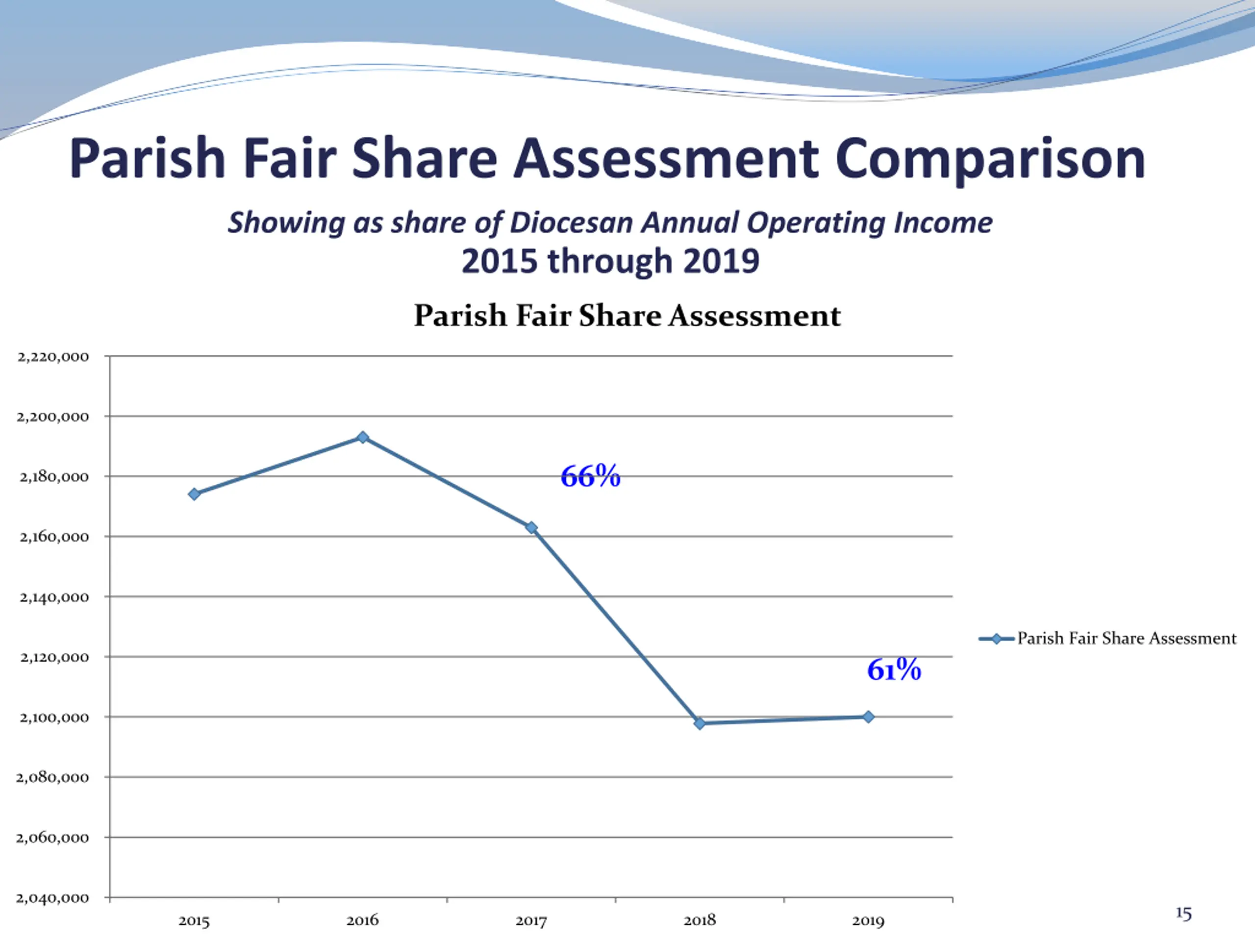 Parish Fair Share Assessment Comparison Showing as share of Diocesan Annual Operating Income 2015 through 2019 Parish Fair Share Assessment 2,220,000 2,200,000 66% 2,180,000 2,160,000 2,140,000 Parish Fair Share Assessment 2,120,000 61% 2,100,000 2,080,000 2,060,000 2,040,000 15 2015 2016 2017 2018 2019