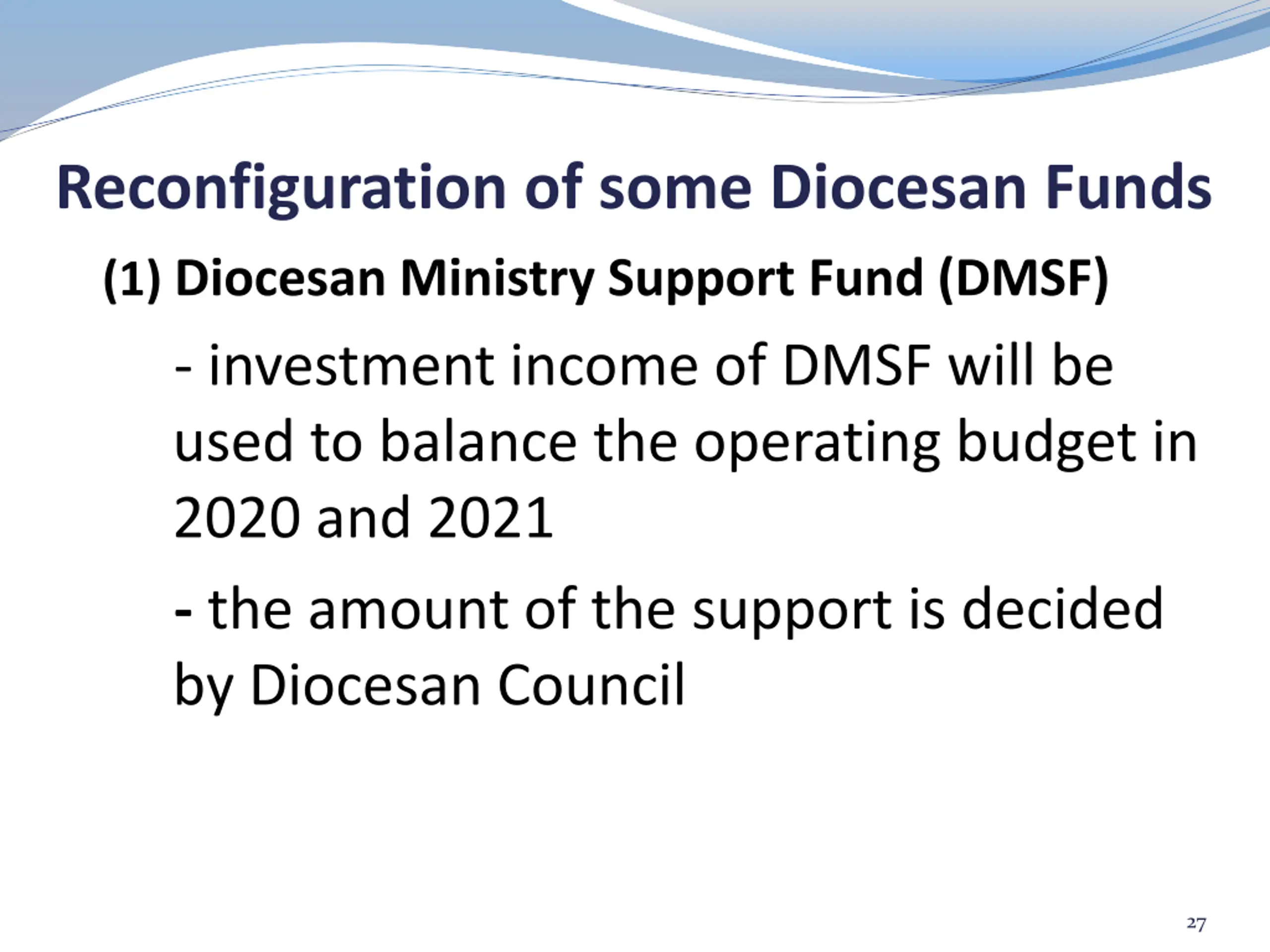 Reconfiguration of some Diocesan Funds (1) Diocesan Ministry Support Fund (DMSF) - investment income of DMSF will be used to balance the operating budget in 2020 and 2021 - the amount of the support is decided by Diocesan Council 27