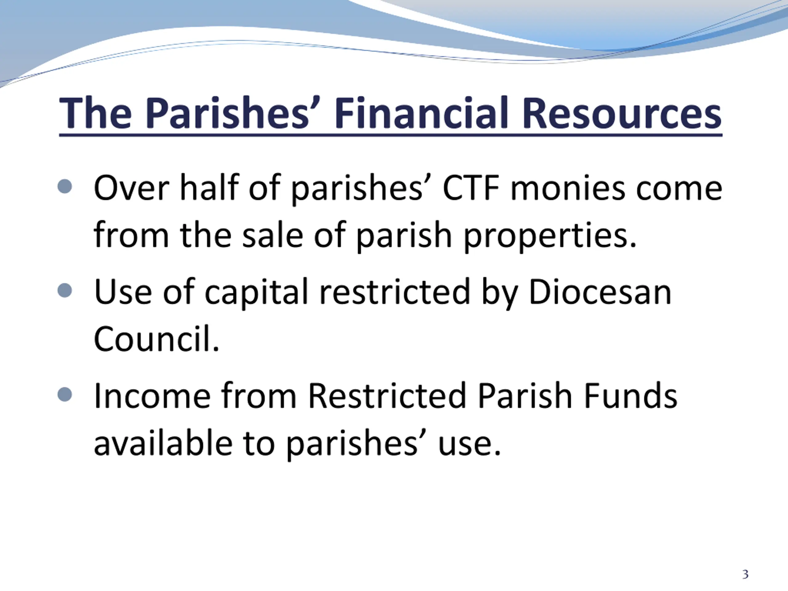 The Parishes Financial Resources Over half of parishes CTF monies come from the sale of parish properties. Use of capital restricted by Diocesan Council. Income from Restricted Parish Funds available to parishes use. 3