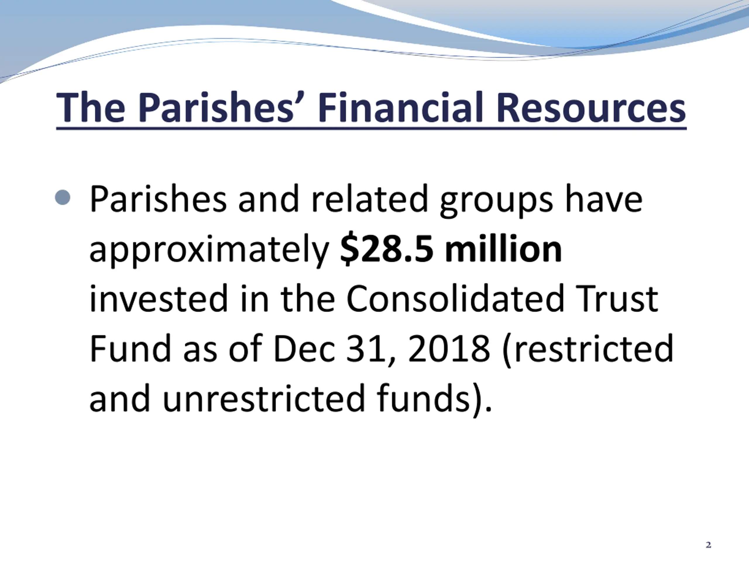 The Parishes Financial Resources Parishes and related groups have approximately $28.5 million invested in the Consolidated Trust Fund as of Dec 31, 2018 (restricted and unrestricted funds). 2
