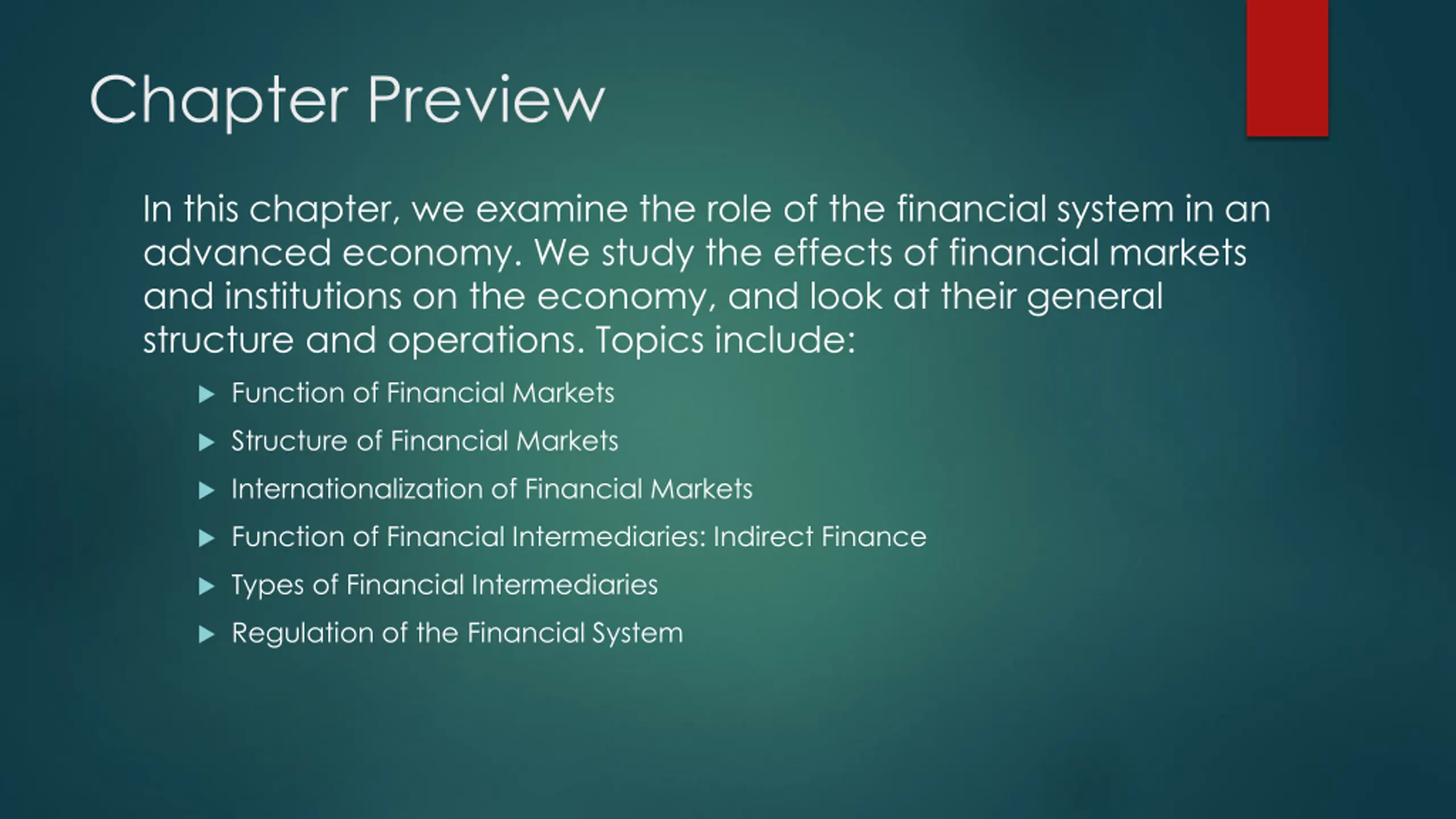 Chapter Preview In this chapter, we examine the role of the financial system in an advanced economy. We study the effects of financial markets and institutions on the economy, and look at their general structure and operations. Topics include: Function of Financial Markets Structure of Financial Markets Internationalization of Financial Markets Function of Financial Intermediaries: Indirect Finance Types of Financial Intermediaries Regulation of the Financial System