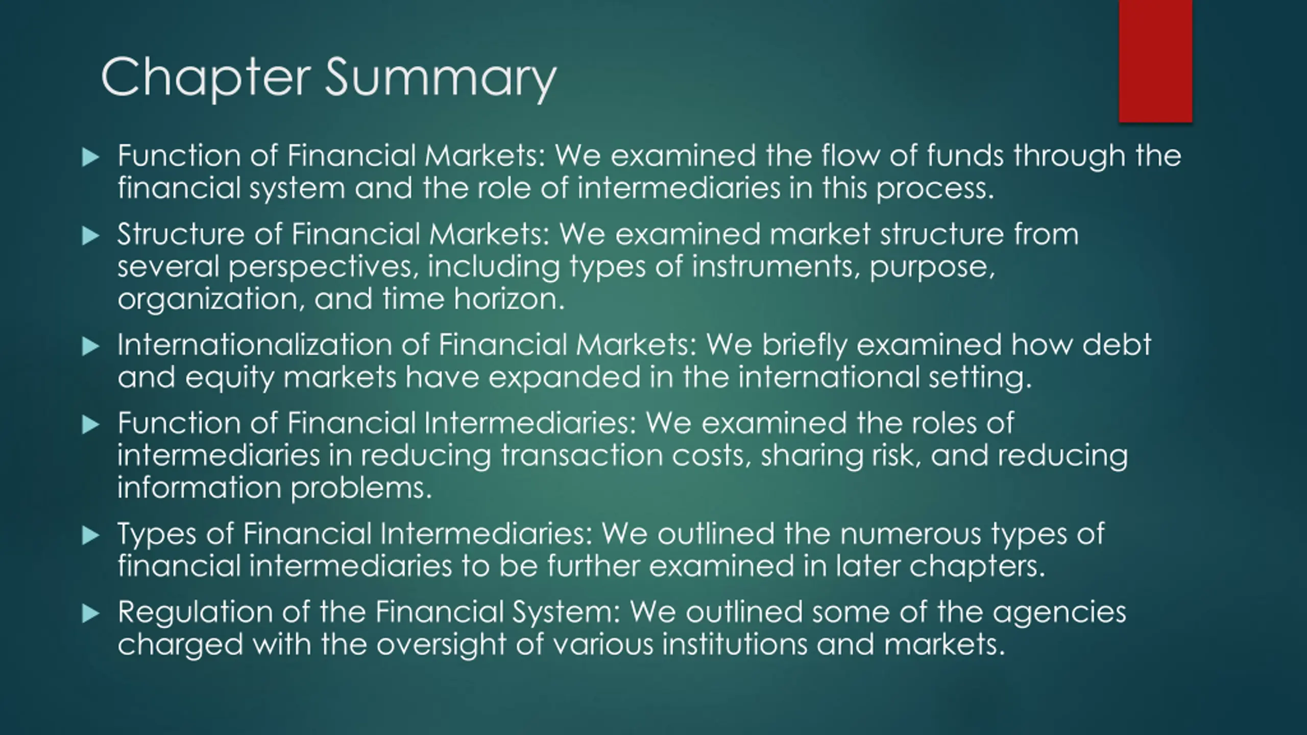 Chapter Summary Function of Financial Markets: We examined the flow of funds through the financial system and the role of intermediaries in this process. Structure of Financial Markets: We examined market structure from several perspectives, including types of instruments, purpose, organization, and time horizon. Internationalization of Financial Markets: We briefly examined how debt and equity markets have expanded in the international setting. Function of Financial Intermediaries: We examined the roles of intermediaries in reducing transaction costs, sharing risk, and reducing information problems. Types of Financial Intermediaries: We outlined the numerous types of financial intermediaries to be further examined in later chapters. Regulation of the Financial System: We outlined some of the agencies charged with the oversight of various institutions and markets.