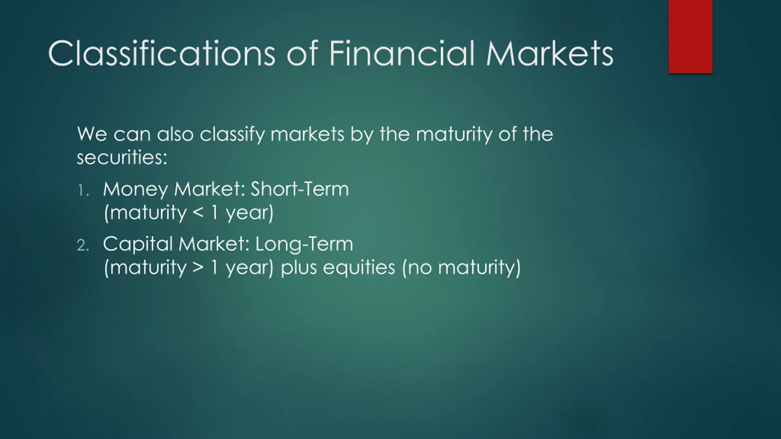 Classifications of Financial Markets We can also classify markets by the maturity of the securities: 1. Money Market: Short-Term (maturity < 1 year) 2. Capital Market: Long-Term (maturity > 1 year) plus equities (no maturity)