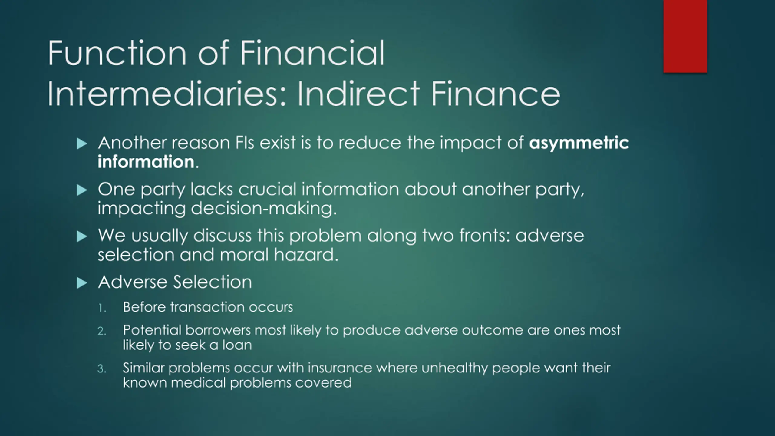 Function of Financial Intermediaries: Indirect Finance Another reason FIs exist is to reduce the impact of asymmetric information. One party lacks crucial information about another party, impacting decision-making. We usually discuss this problem along two fronts: adverse selection and moral hazard. Adverse Selection Before transaction occurs Potential borrowers most likely to produce adverse outcome are ones most likely to seek a loan Similar problems occur with insurance where unhealthy people want their known medical problems covered 1. 2. 3.