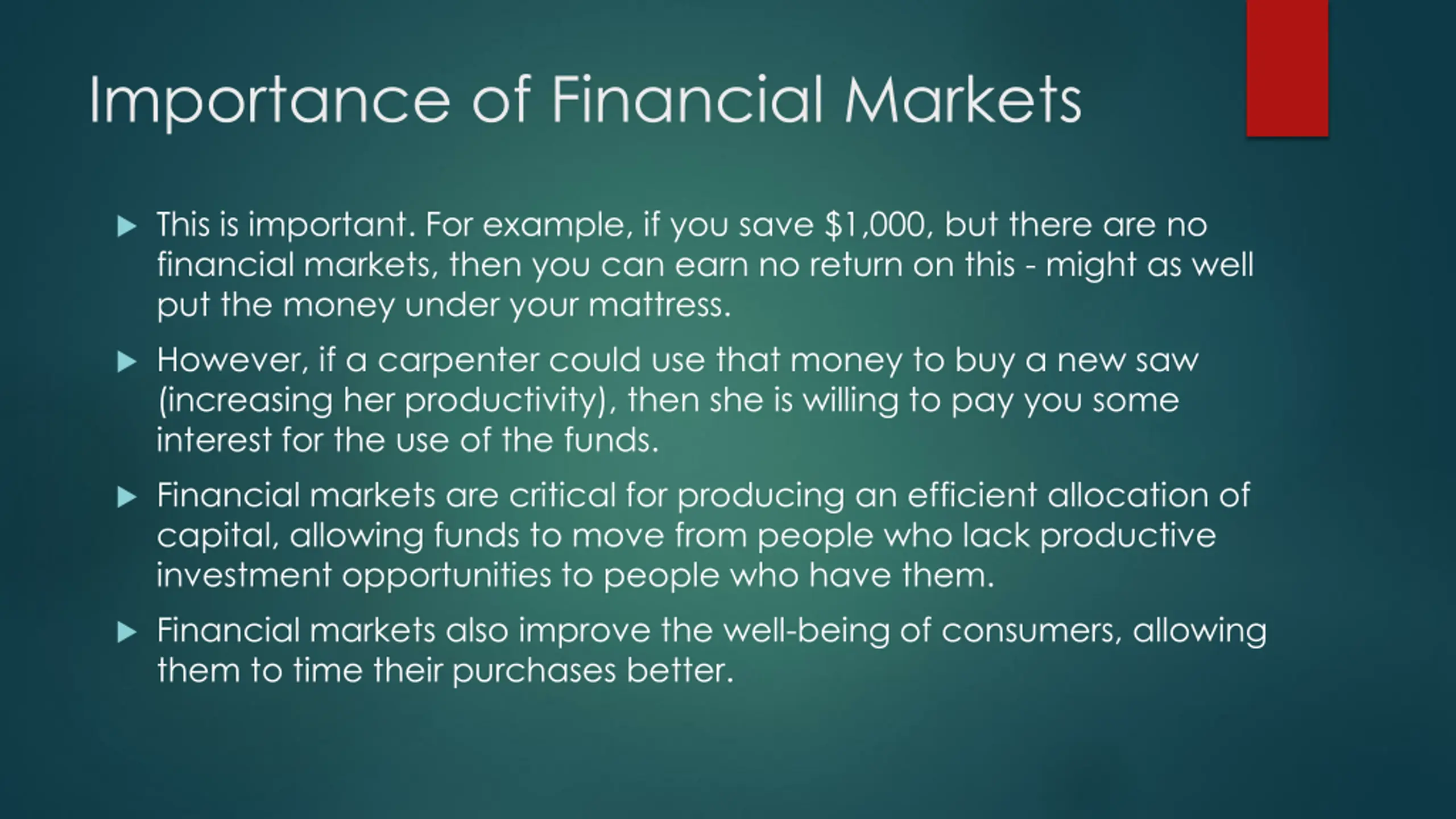 Importance of Financial Markets This is important. For example, if you save $1,000, but there are no financial markets, then you can earn no return on this - might as well put the money under your mattress. However, if a carpenter could use that money to buy a new saw (increasing her productivity), then she is willing to pay you some interest for the use of the funds. Financial markets are critical for producing an efficient allocation of capital, allowing funds to move from people who lack productive investment opportunities to people who have them. Financial markets also improve the well-being of consumers, allowing them to time their purchases better.