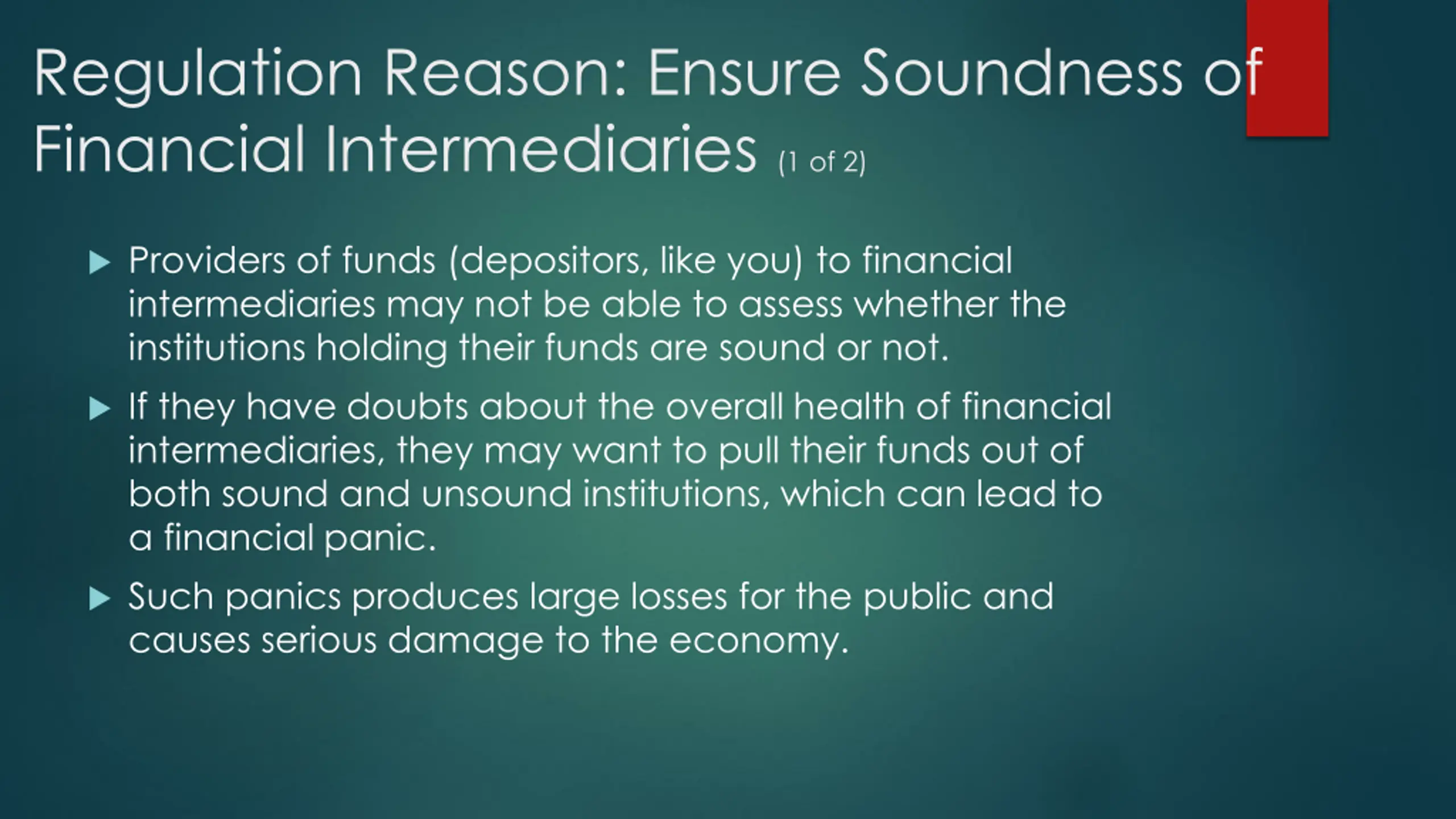 Regulation Reason: Ensure Soundness of Financial Intermediaries (1 of 2) Providers of funds (depositors, like you) to financial intermediaries may not be able to assess whether the institutions holding their funds are sound or not. If they have doubts about the overall health of financial intermediaries, they may want to pull their funds out of both sound and unsound institutions, which can lead to a financial panic. Such panics produces large losses for the public and causes serious damage to the economy.