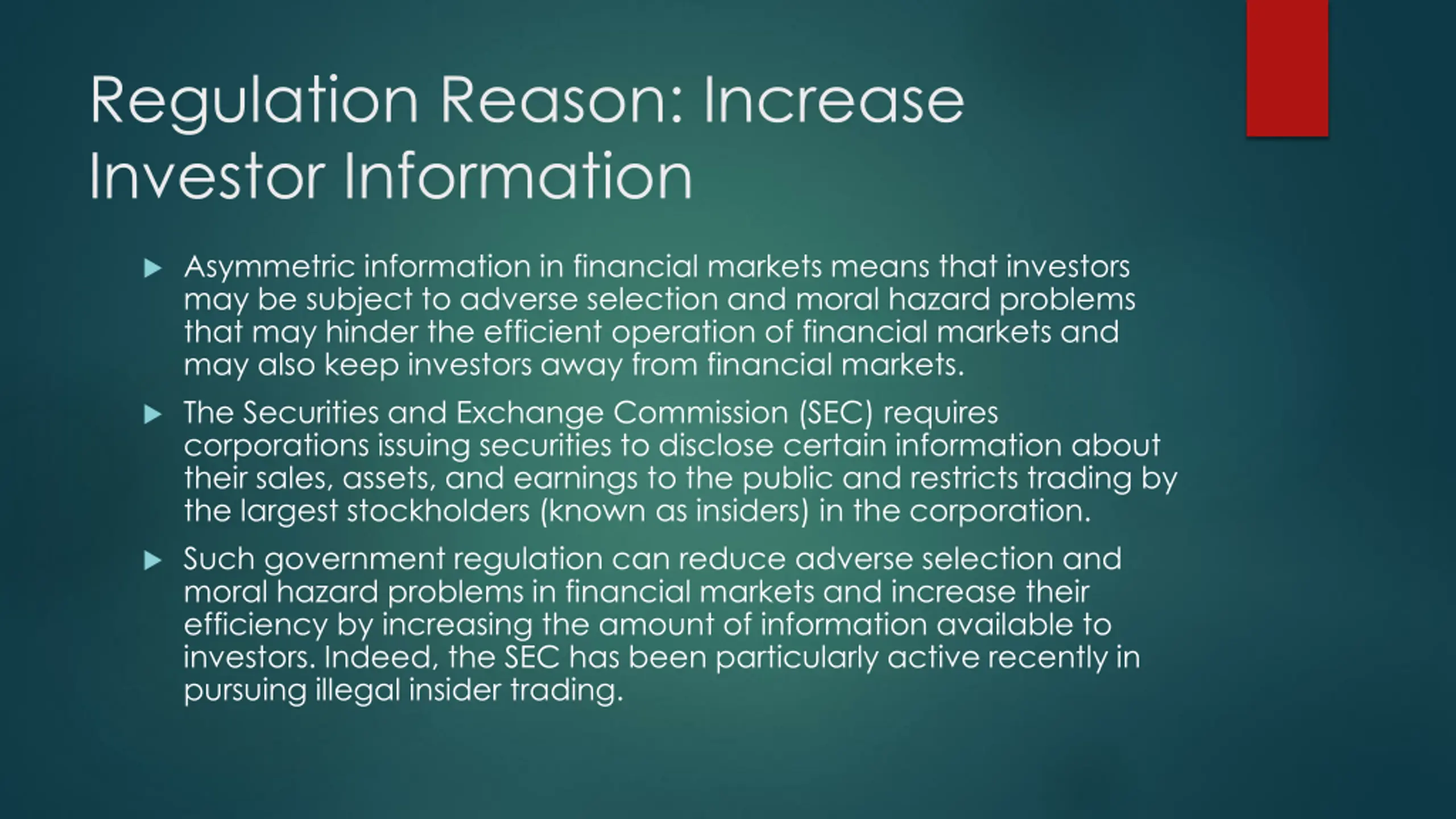 Regulation Reason: Increase Investor Information Asymmetric information in financial markets means that investors may be subject to adverse selection and moral hazard problems that may hinder the efficient operation of financial markets and may also keep investors away from financial markets. The Securities and Exchange Commission (SEC) requires corporations issuing securities to disclose certain information about their sales, assets, and earnings to the public and restricts trading by the largest stockholders (known as insiders) in the corporation. Such government regulation can reduce adverse selection and moral hazard problems in financial markets and increase their efficiency by increasing the amount of information available to investors. Indeed, the SEC has been particularly active recently in pursuing illegal insider trading.