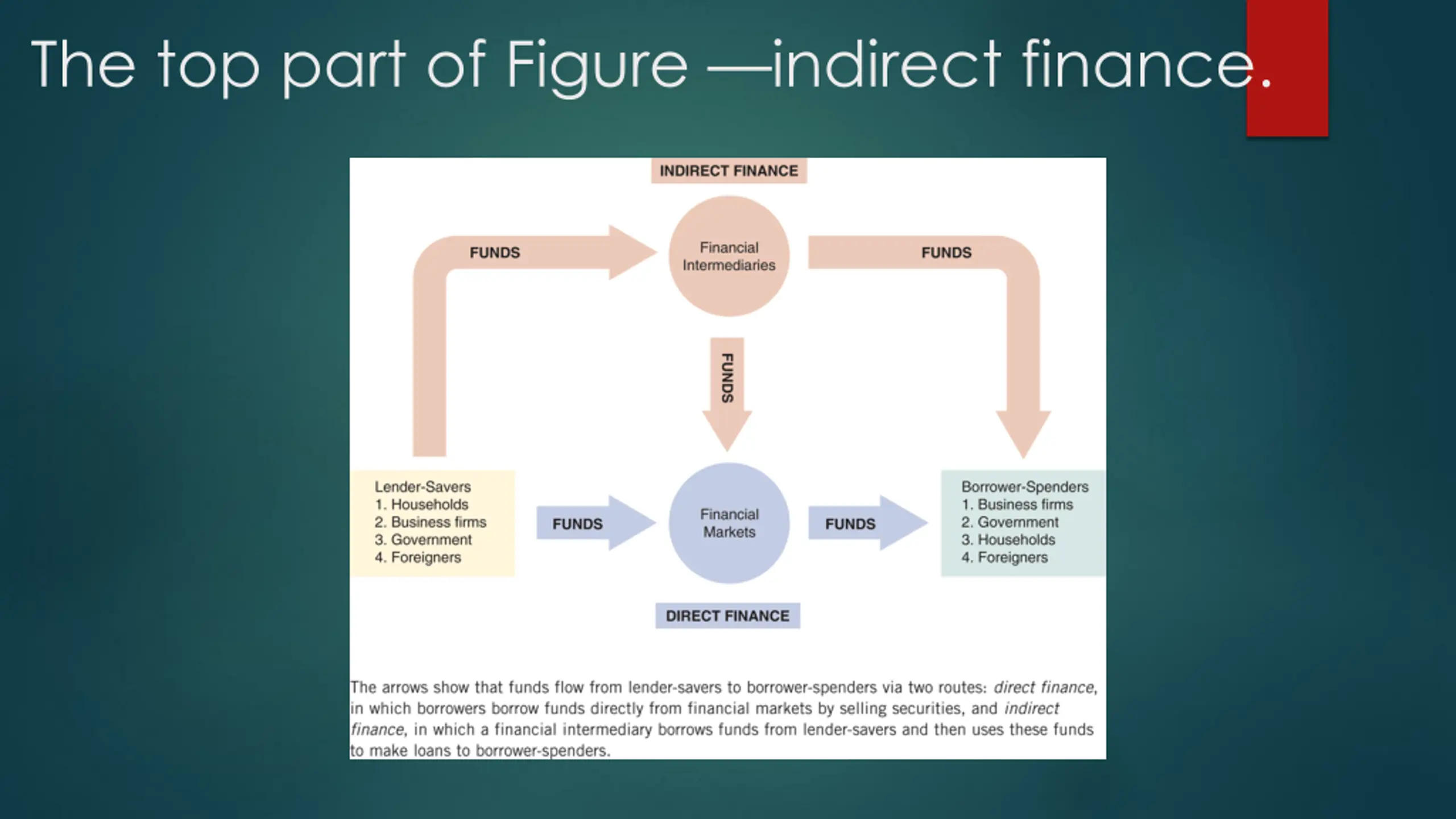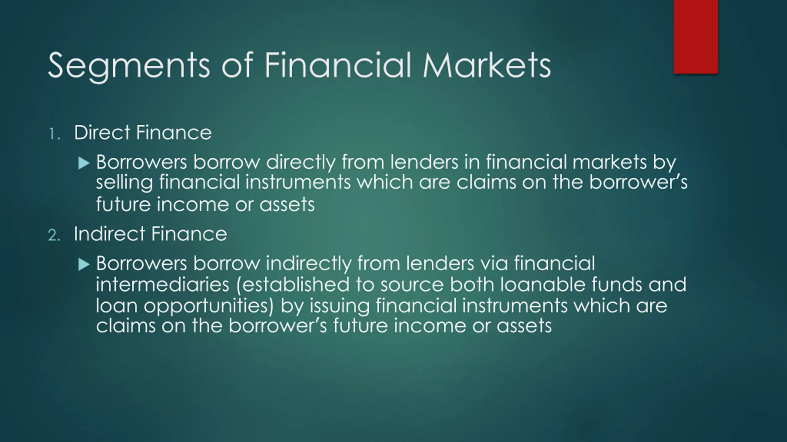 Segments of Financial Markets 1. Direct Finance Borrowers borrow directly from lenders in financial markets by selling financial instruments which are claims on the borrower s future income or assets 2. Indirect Finance Borrowers borrow indirectly from lenders via financial intermediaries (established to source both loanable funds and loan opportunities) by issuing financial instruments which are claims on the borrower s future income or assets