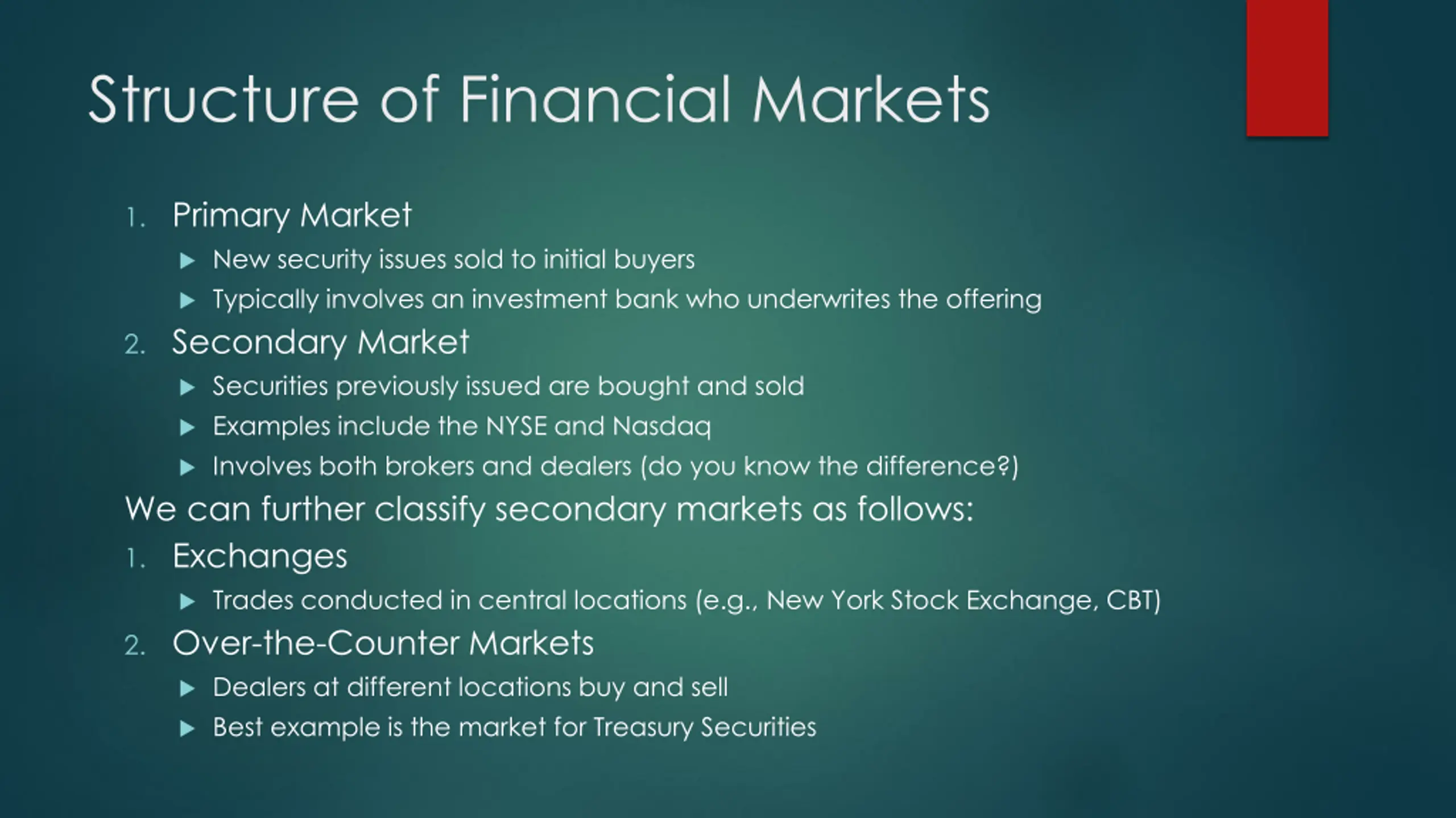 Structure of Financial Markets 1. Primary Market New security issues sold to initial buyers Typically involves an investment bank who underwrites the offering 2. Secondary Market Securities previously issued are bought and sold Examples include the NYSE and Nasdaq Involves both brokers and dealers (do you know the difference?) We can further classify secondary markets as follows: 1. Exchanges Trades conducted in central locations (e.g., New York Stock Exchange, CBT) 2. Over-the-Counter Markets Dealers at different locations buy and sell Best example is the market for Treasury Securities