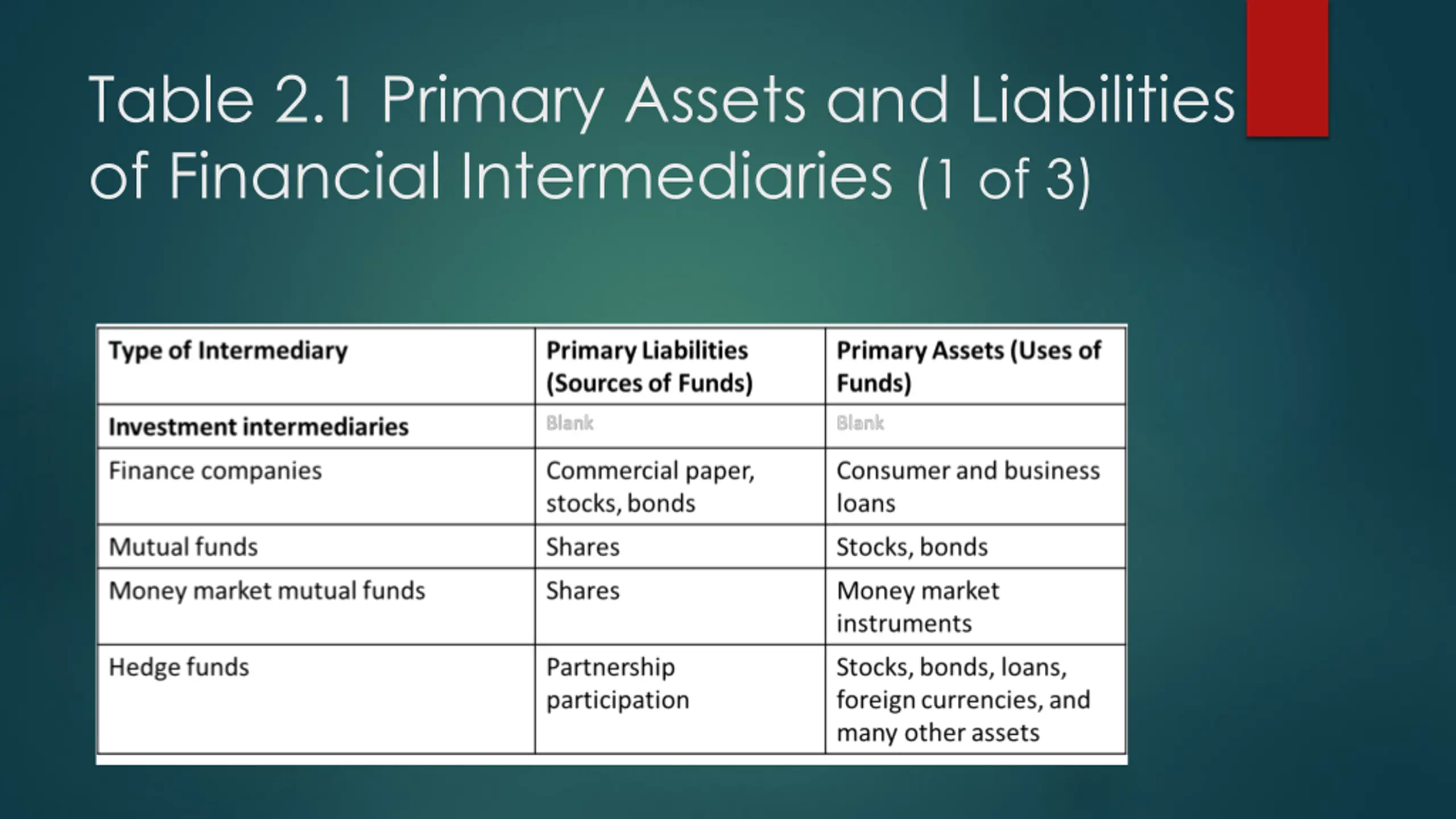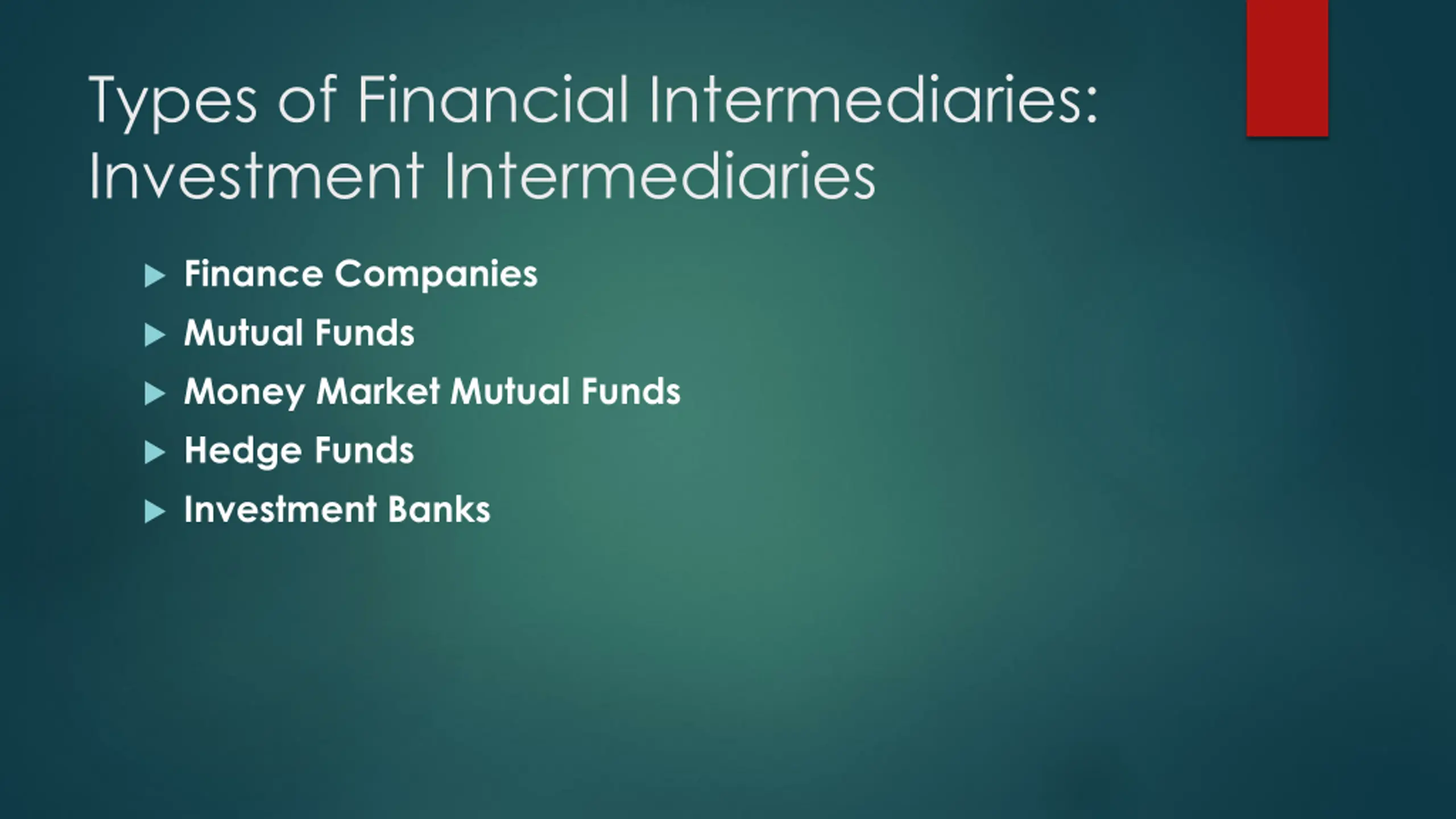 Types of Financial Intermediaries: Investment Intermediaries Finance Companies Mutual Funds Money MarketMutual Funds Hedge Funds Investment Banks