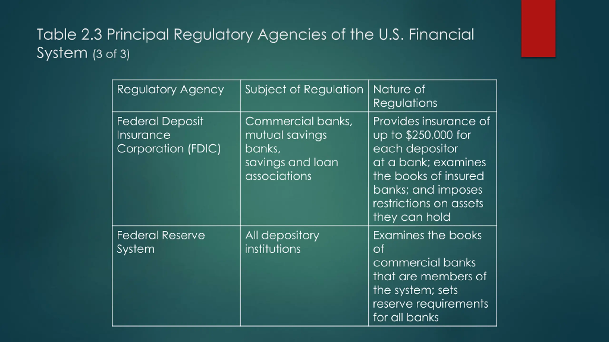 Table 2.3 Principal Regulatory Agencies of the U.S. Financial System (3 of 3) Regulatory Agency Subject of Regulation Nature of Regulations Provides insurance of up to $250,000 for each depositor at a bank; examines the books of insured banks; and imposes restrictions on assets they can hold Examines the books of commercial banks that are members of the system; sets reserve requirements for all banks Federal Deposit Insurance Corporation (FDIC) Commercial banks, mutual savings banks, savings and loan associations Federal Reserve System All depository institutions