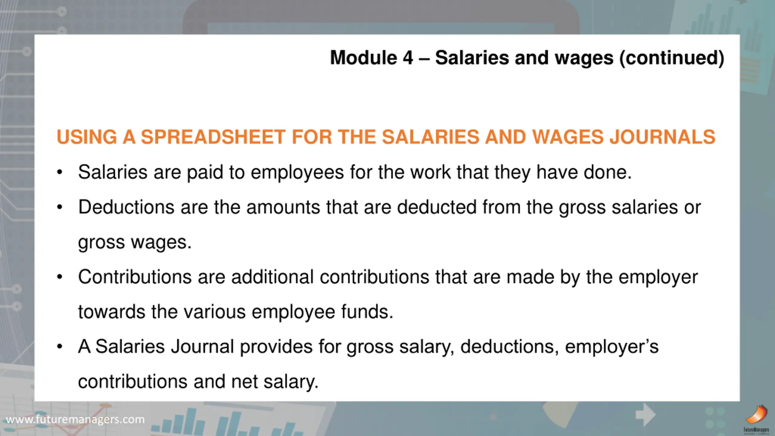 Module 4 Salaries and wages (continued) USING A SPREADSHEET FOR THE SALARIES AND WAGES JOURNALS Salaries are paid to employees for the work that they have done. Deductions are the amounts that are deducted from the gross salaries or gross wages. Contributions are additional contributions that are made by the employer towards the various employee funds. A Salaries Journal provides for gross salary, deductions, employer s contributions and net salary. www.futuremanagers.com