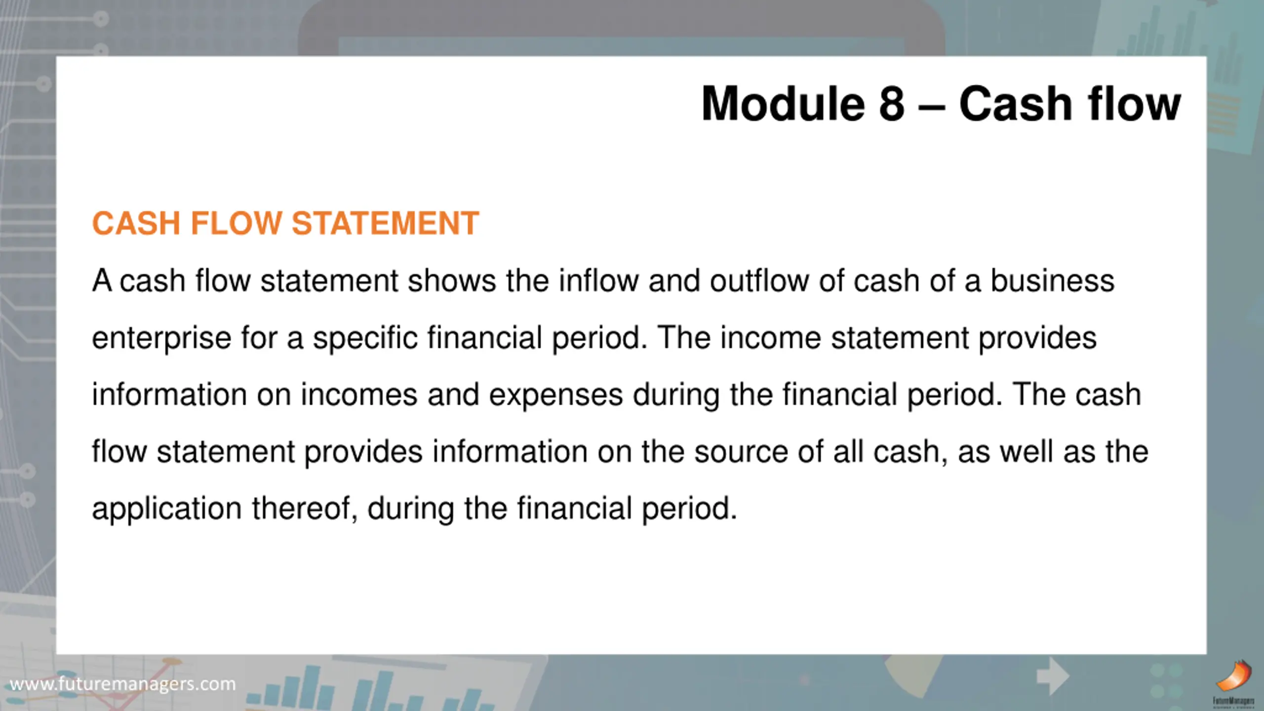 Module 8 Cash flow CASH FLOW STATEMENT A cash flow statement shows the inflow and outflow of cash of a business enterprise for a specific financial period. The income statement provides information on incomes and expenses during the financial period. The cash flow statement provides information on the source of all cash, as well as the application thereof, during the financial period. www.futuremanagers.com