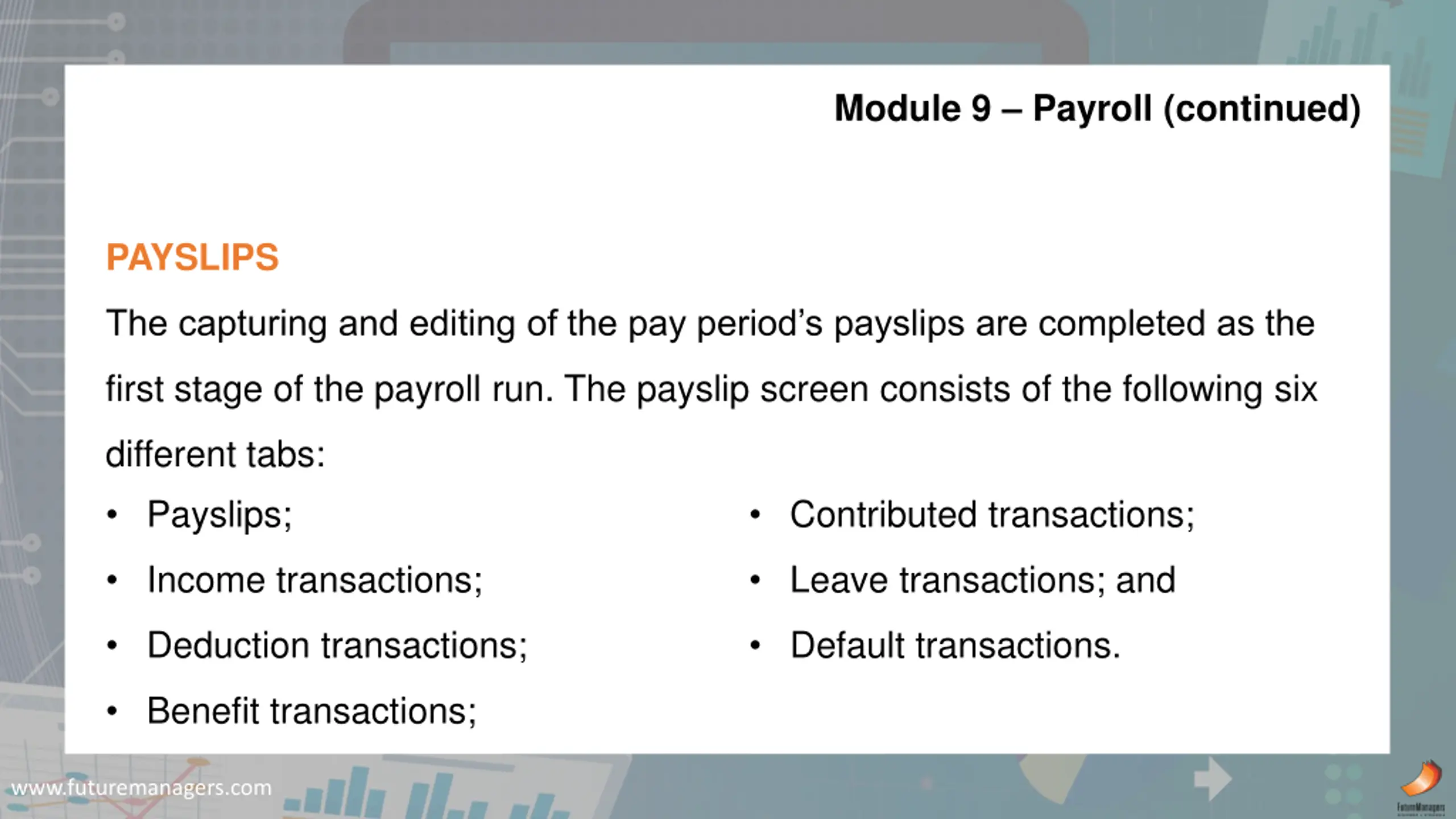 Module 9 Payroll (continued) PAYSLIPS The capturing and editing of the pay period s payslips are completed as the first stage of the payroll run. The payslip screen consists of the following six different tabs: Payslips; Contributed transactions; Income transactions; Leave transactions; and Deduction transactions; Default transactions. Benefit transactions; www.futuremanagers.com