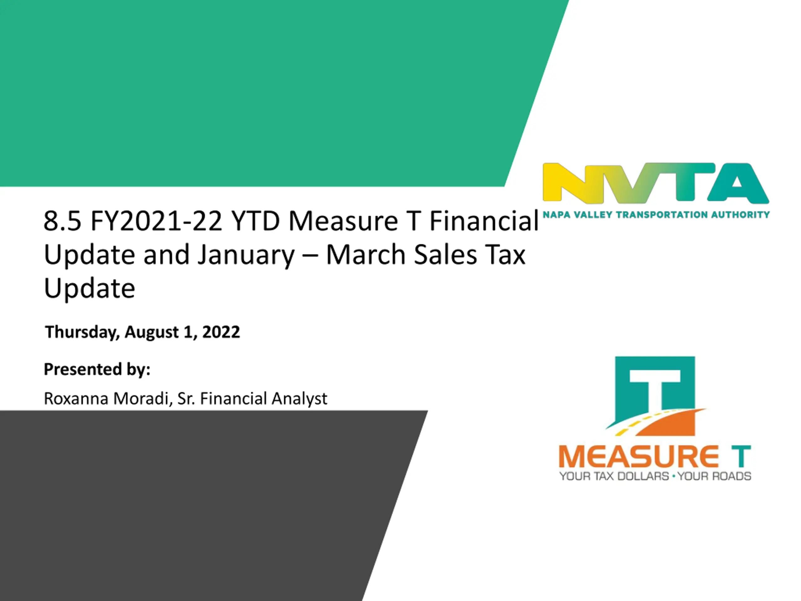 8.5 FY2021-22 YTD Measure T Financial Update and January March Sales Tax Update Thursday, August 1, 2022 Presented by: Roxanna Moradi, Sr. Financial Analyst