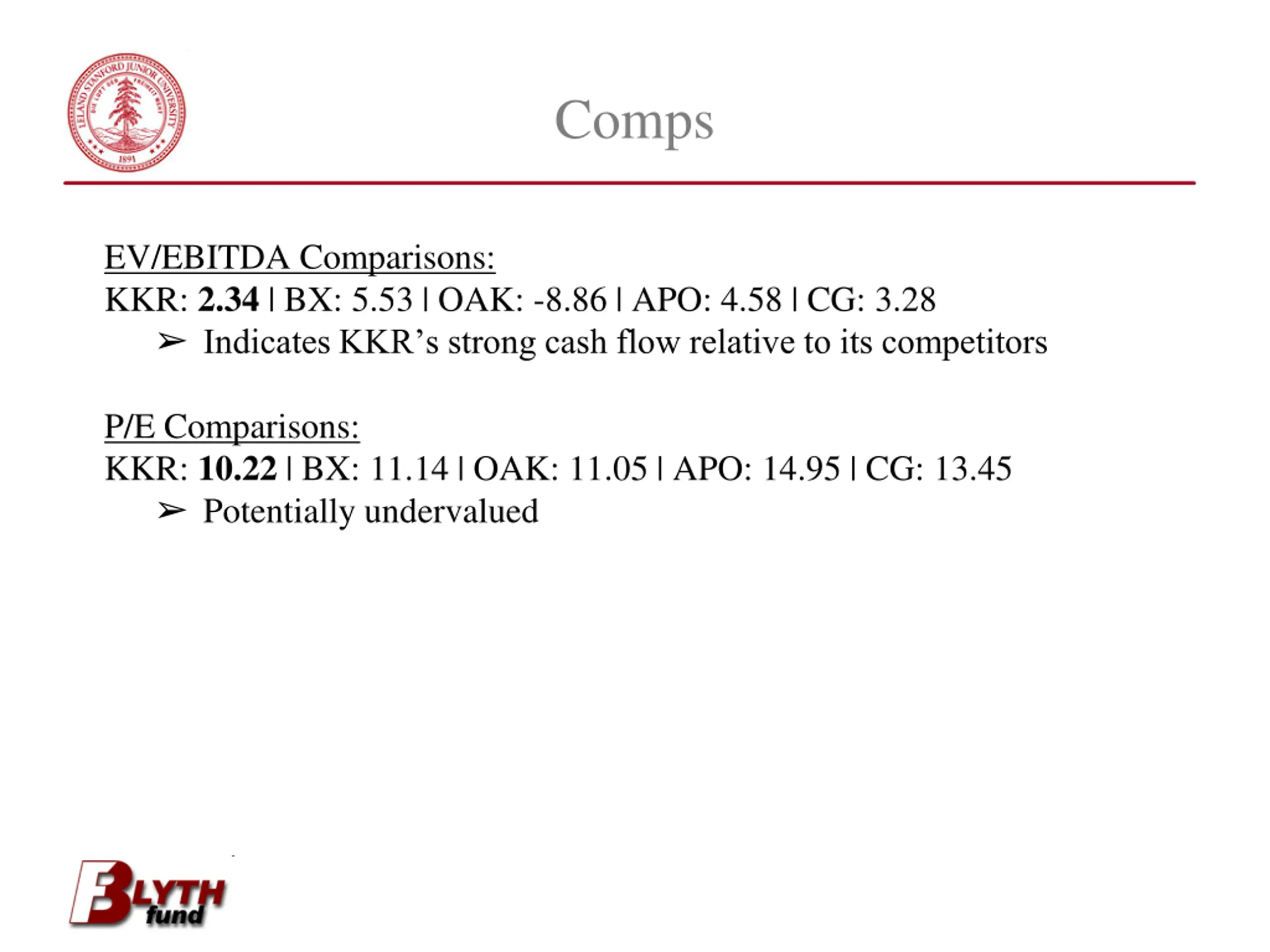 Comps EV/EBITDA Comparisons: KKR: 2.34 | BX: 5.53 | OAK: -8.86 | APO: 4.58 | CG: 3.28 Indicates KKR s strong cash flow relative to its competitors P/E Comparisons: KKR: 10.22 | BX: 11.14 | OAK: 11.05 | APO: 14.95 | CG: 13.45 Potentially undervalued