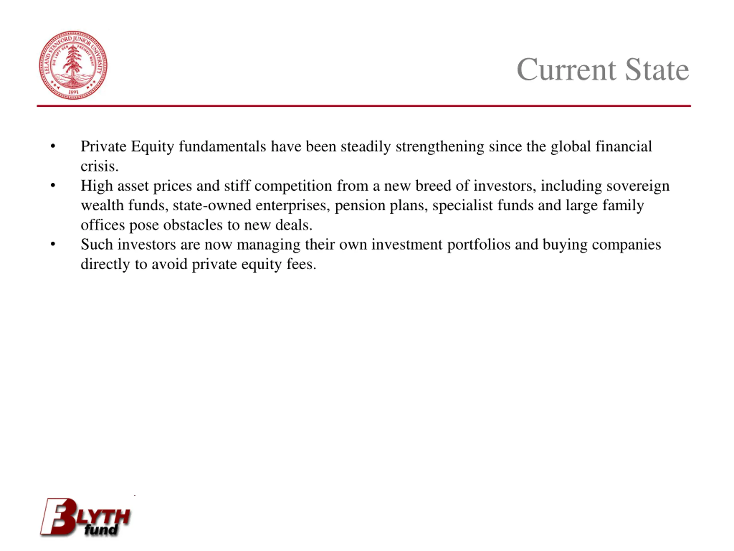 Current State Private Equity fundamentals have been steadily strengthening since the global financial crisis. High asset prices and stiff competition from a new breed of investors, including sovereign wealth funds, state-owned enterprises, pension plans, specialist funds and large family offices pose obstacles to new deals. Such investors are now managing their own investment portfolios and buying companies directly to avoid private equity fees.