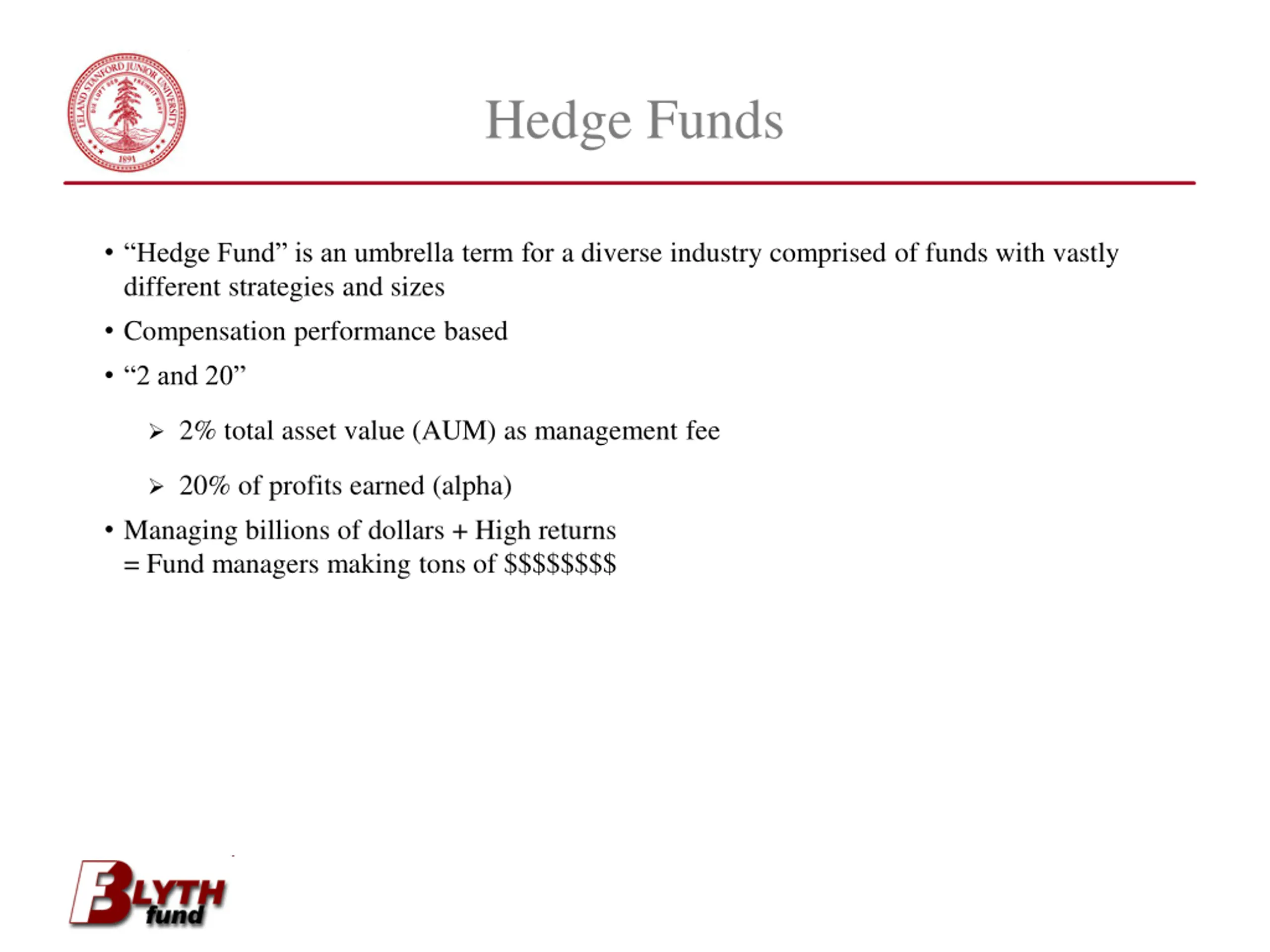 Hedge Funds Hedge Fund is an umbrella term for a diverse industry comprised of funds with vastly different strategies and sizes Compensation performance based 2 and 20 2% total asset value (AUM) as management fee 20% of profits earned (alpha) Managing billions of dollars + High returns = Fund managers making tons of $$$$$$$$
