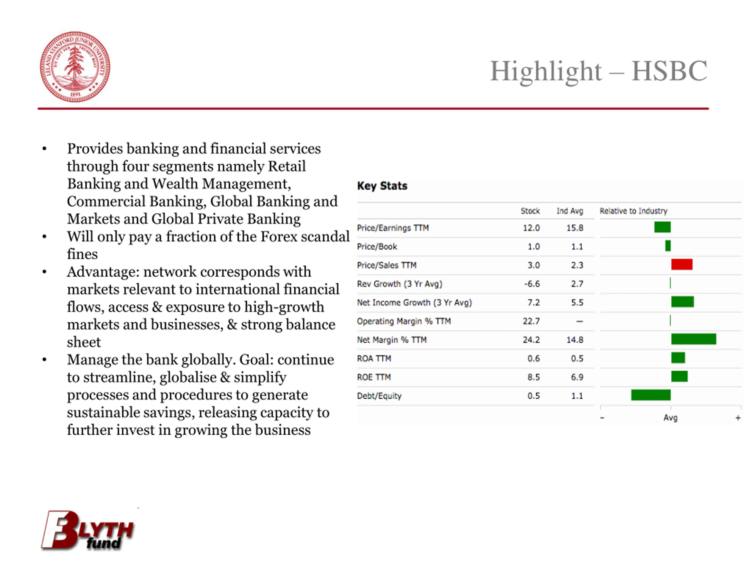 Highlight HSBC Provides banking and financial services through four segments namely Retail Banking and Wealth Management, Commercial Banking, Global Banking and Markets and Global Private Banking Will only pay a fraction of the Forex scandal fines Advantage: network corresponds with markets relevant to international financial flows, access & exposure to high-growth markets and businesses, & strong balance sheet Manage the bank globally. Goal: continue to streamline, globalise & simplify processes and procedures to generate sustainable savings, releasing capacity to further invest in growing the business