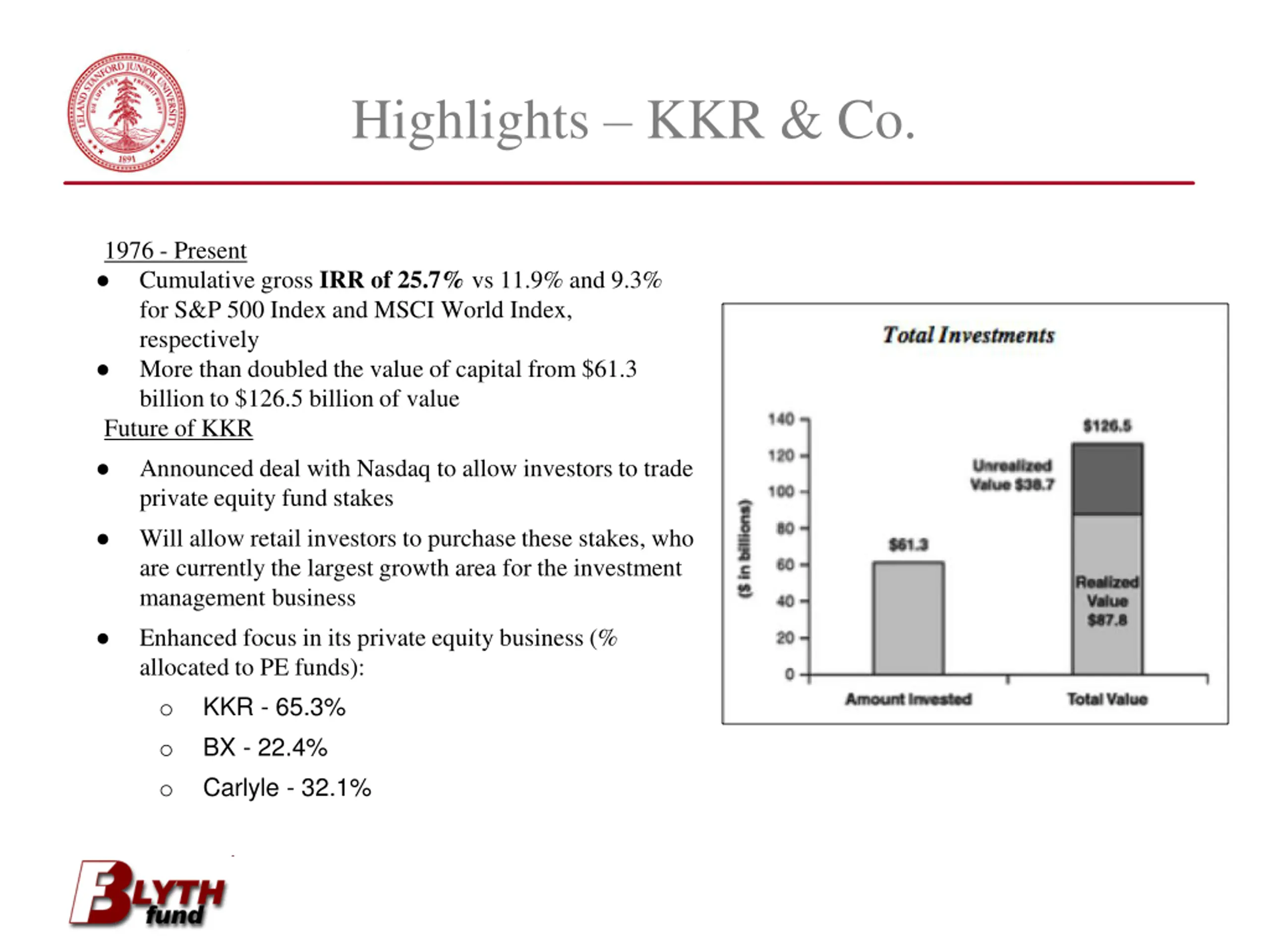 Highlights KKR & Co. 1976 - Present Cumulative gross IRR of 25.7% vs 11.9% and 9.3% for S&P 500 Index and MSCI World Index, respectively More than doubled the value of capital from $61.3 billion to $126.5 billion of value Future of KKR Announced deal with Nasdaq to allow investors to trade private equity fund stakes Will allow retail investors to purchase these stakes, who are currently the largest growth area for the investment management business Enhanced focus in its private equity business (% allocated to PE funds): KKR - 65.3% BX - 22.4% Carlyle - 32.1% o o o
