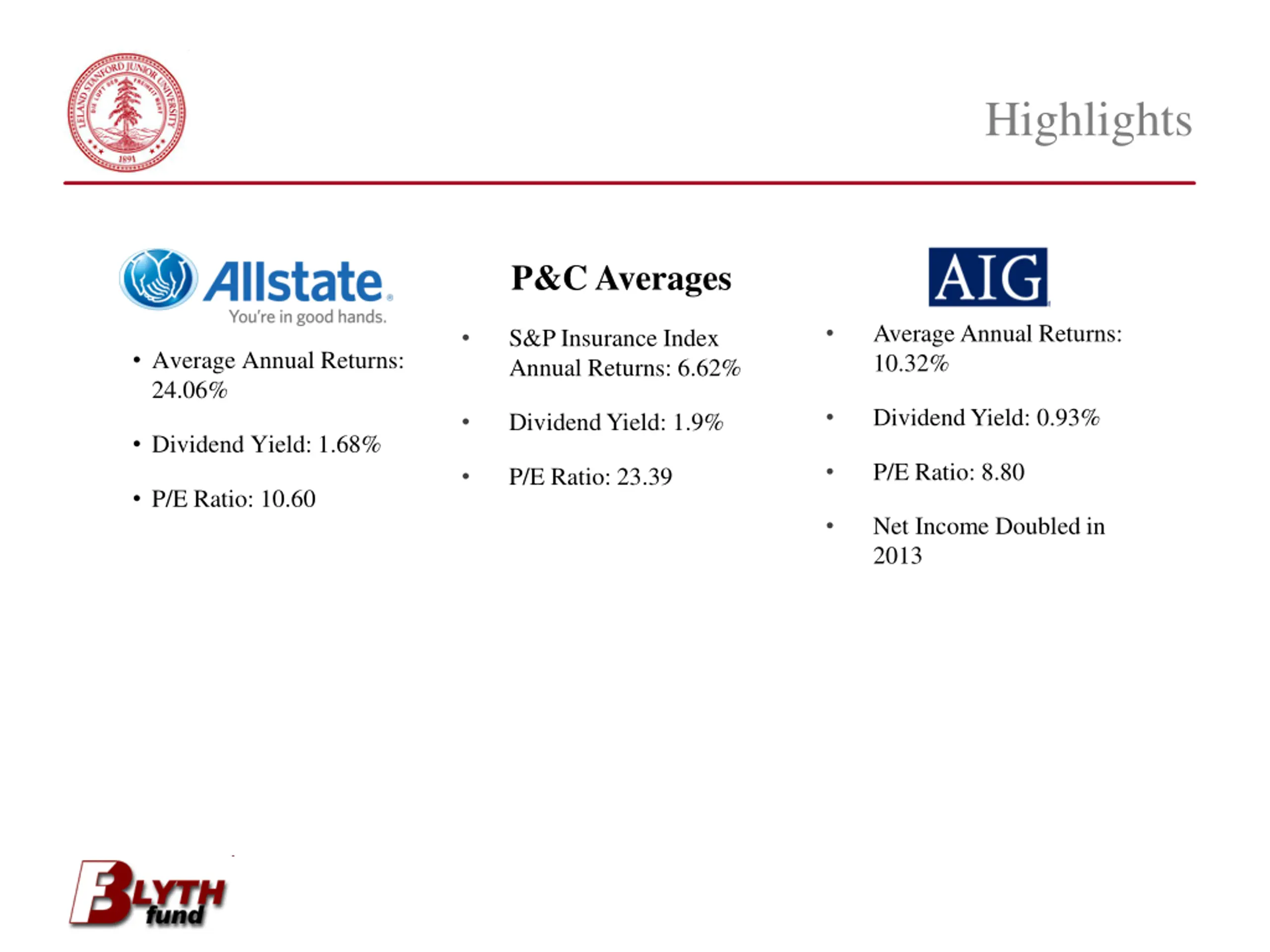Highlights P&C Averages Average Annual Returns: 10.32% S&P Insurance Index Annual Returns: 6.62% Average Annual Returns: 24.06% Dividend Yield: 0.93% Dividend Yield: 1.9% Dividend Yield: 1.68% P/E Ratio: 8.80 P/E Ratio: 23.39 P/E Ratio: 10.60 Net Income Doubled in 2013