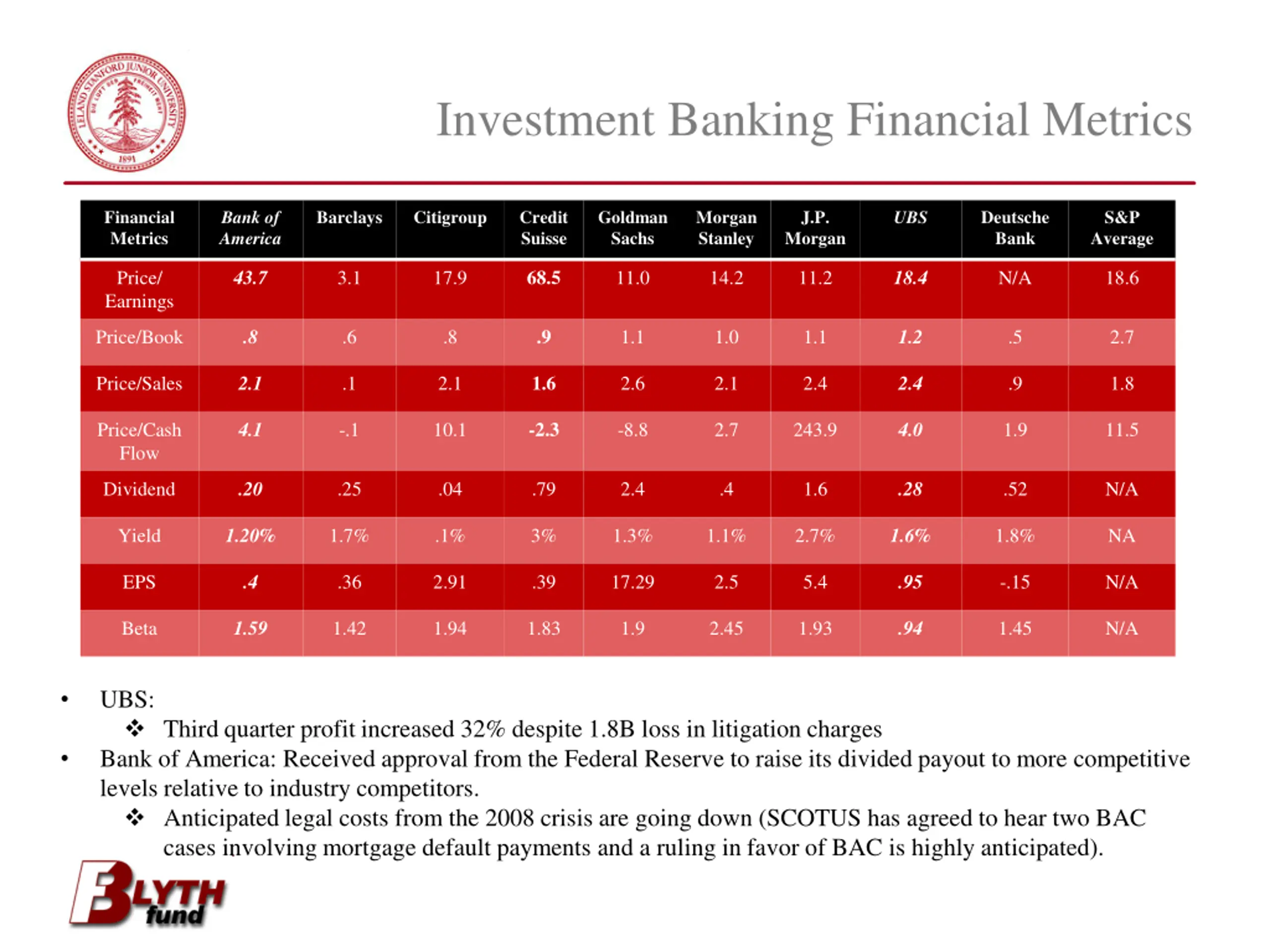 Investment Banking Financial Metrics Bank of America UBS Financial Metrics Barclays Citigroup Credit Suisse Goldman Sachs Morgan Stanley J.P. Morgan Deutsche Bank S&P Average 43.7 18.4 68.5 Price/ Earnings 3.1 17.9 11.0 14.2 11.2 N/A 18.6 .8 1.2 .9 Price/Book .6 .8 1.1 1.0 1.1 .5 2.7 2.1 2.4 1.6 Price/Sales .1 2.1 2.6 2.1 2.4 .9 1.8 4.1 4.0 -2.3 Price/Cash Flow -.1 10.1 -8.8 2.7 243.9 1.9 11.5 .20 .28 Dividend .25 .04 .79 2.4 .4 1.6 .52 N/A 1.20% 1.6% Yield 1.7% .1% 3% 1.3% 1.1% 2.7% 1.8% NA .4 .95 EPS .36 2.91 .39 17.29 2.5 5.4 -.15 N/A 1.59 .94 Beta 1.42 1.94 1.83 1.9 2.45 1.93 1.45 N/A UBS: Third quarter profit increased 32% despite 1.8B loss in litigation charges Bank of America: Received approval from the Federal Reserve to raise its divided payout to more competitive levels relative to industry competitors. Anticipated legal costs from the 2008 crisis are going down (SCOTUS has agreed to hear two BAC cases involving mortgage default payments and a ruling in favor of BAC is highly anticipated).