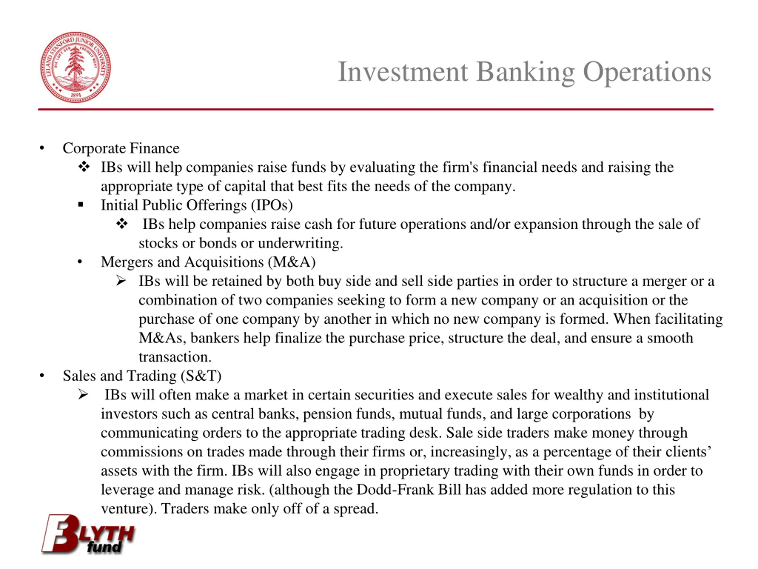 Investment Banking Operations Corporate Finance IBs will help companies raise funds by evaluating the firm's financial needs and raising the appropriate type of capital that best fits the needs of the company. Initial Public Offerings (IPOs) IBs help companies raise cash for future operations and/or expansion through the sale of stocks or bonds or underwriting. Mergers and Acquisitions (M&A) IBs will be retained by both buy side and sell side parties in order to structure a merger or a combination of two companies seeking to form a new company or an acquisition or the purchase of one company by another in which no new company is formed. When facilitating M&As, bankers help finalize the purchase price, structure the deal, and ensure a smooth transaction. Sales and Trading (S&T) IBs will often make a market in certain securities and execute sales for wealthy and institutional investors such as central banks, pension funds, mutual funds, and large corporations by communicating orders to the appropriate trading desk. Sale side traders make money through commissions on trades made through their firms or, increasingly, as a percentage of their clients assets with the firm. IBs will also engage in proprietary trading with their own funds in order to leverage and manage risk. (although the Dodd-Frank Bill has added more regulation to this venture). Traders make only off of a spread.