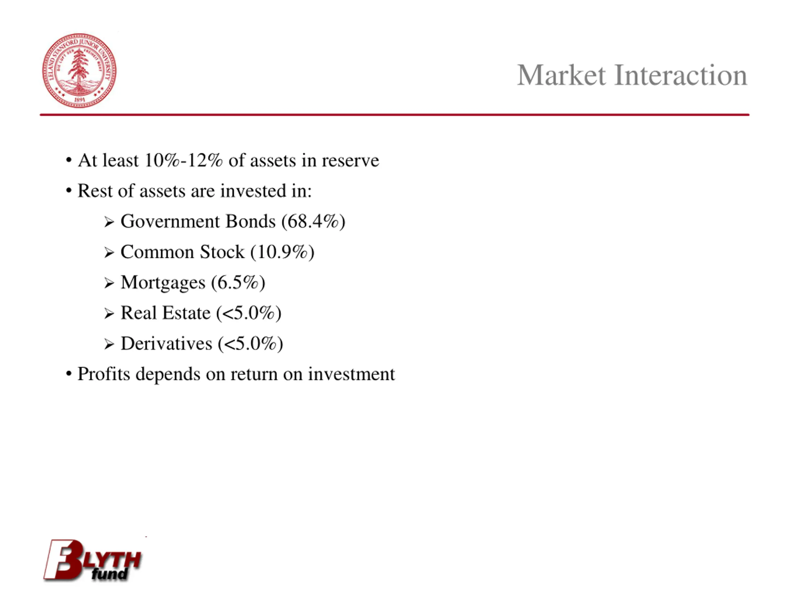 Market Interaction At least 10%-12% of assets in reserve Rest of assets are invested in: Government Bonds (68.4%) Common Stock (10.9%) Mortgages (6.5%) Real Estate (<5.0%) Derivatives (<5.0%) Profits depends on return on investment