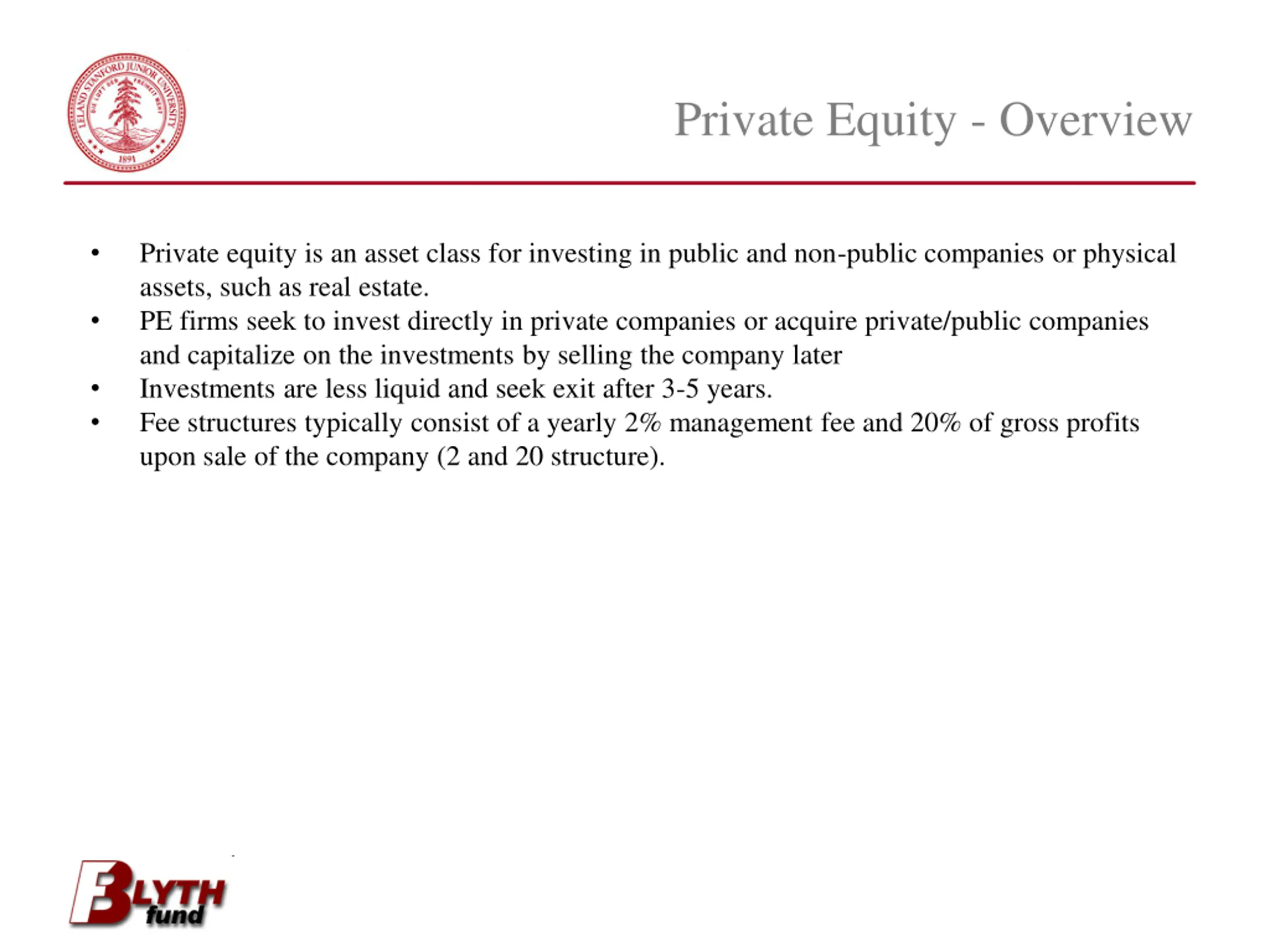Private Equity - Overview Private equity is an asset class for investing in public and non-public companies or physical assets, such as real estate. PE firms seek to invest directly in private companies or acquire private/public companies and capitalize on the investments by selling the company later Investments are less liquid and seek exit after 3-5 years. Fee structures typically consist of a yearly 2% management fee and 20% of gross profits upon sale of the company (2 and 20 structure).