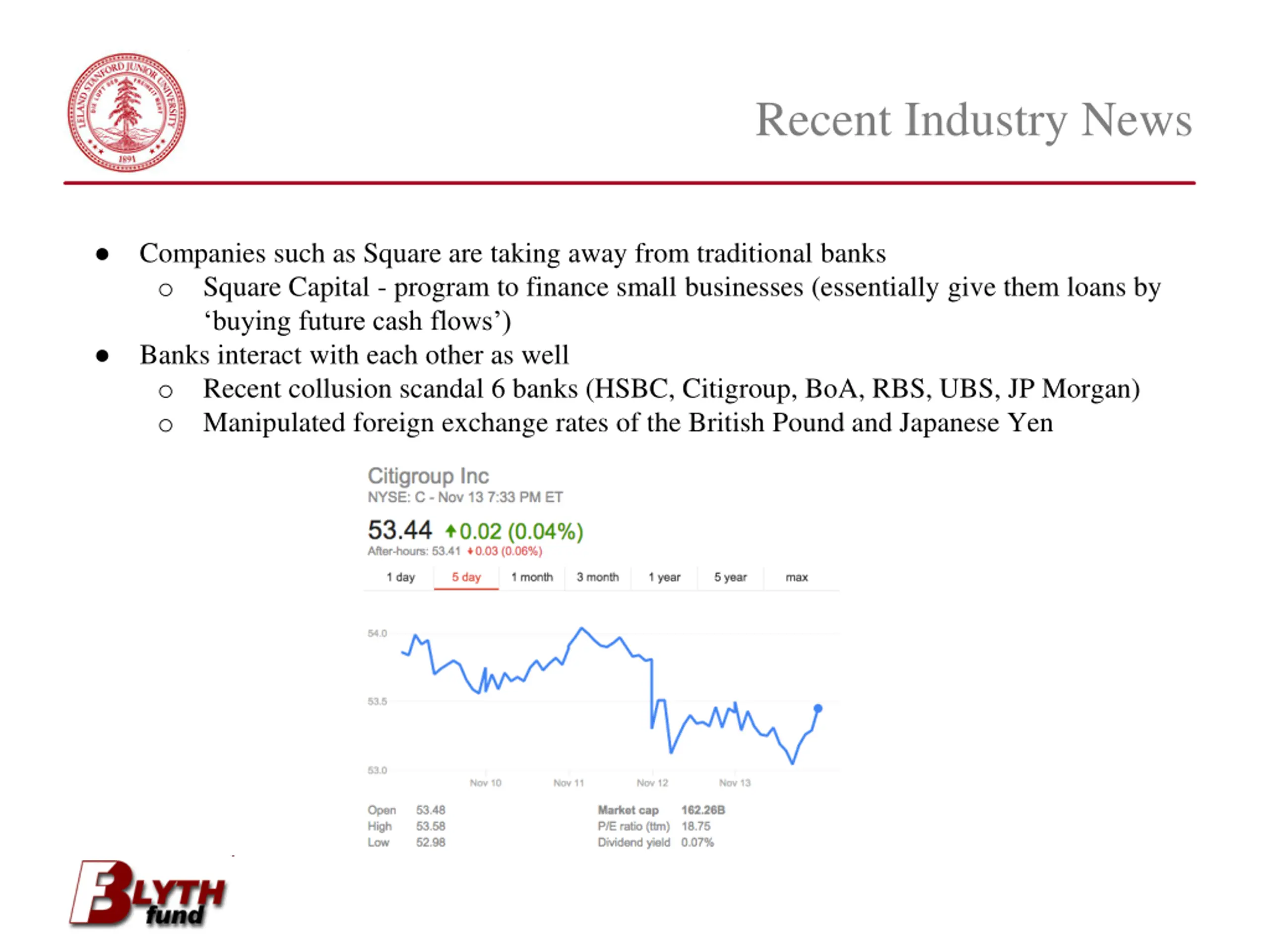 Recent Industry News Companies such as Square are taking away from traditional banks o Square Capital - program to finance small businesses (essentially give them loans by buying future cash flows ) Banks interact with each other as well o Recent collusion scandal 6 banks (HSBC, Citigroup, BoA, RBS, UBS, JP Morgan) o Manipulated foreign exchange rates of the British Pound and Japanese Yen