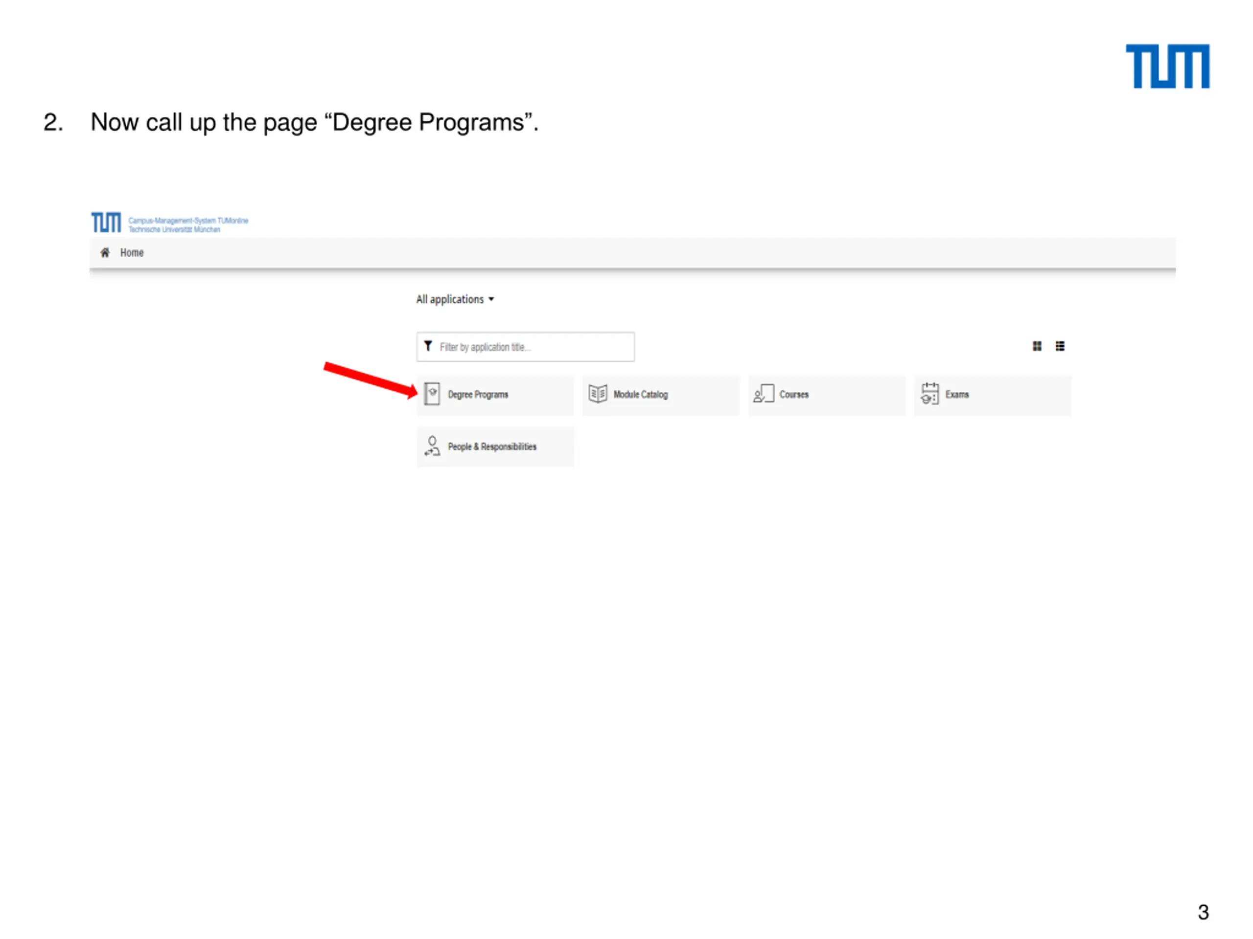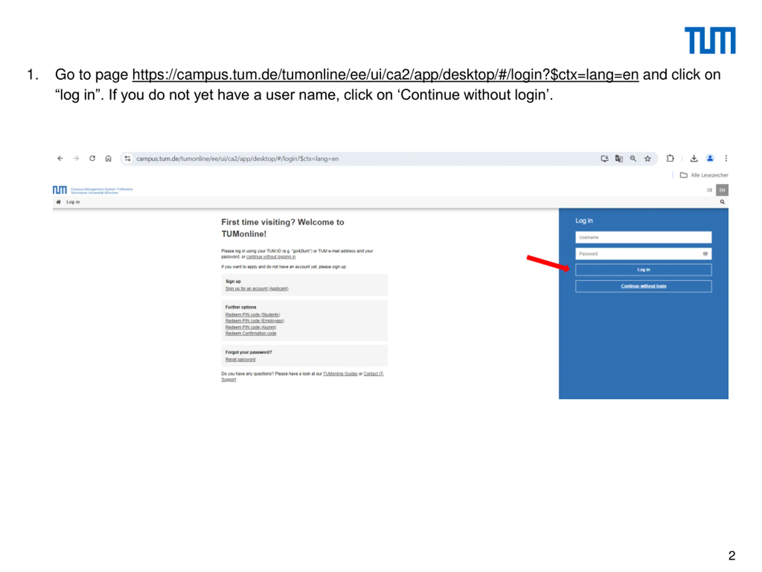 1. Go to page https://campus.tum.de/tumonline/ee/ui/ca2/app/desktop/#/login?$ctx=lang=en and click on log in . If you do not yet have a user name, click on Continue without login . 2