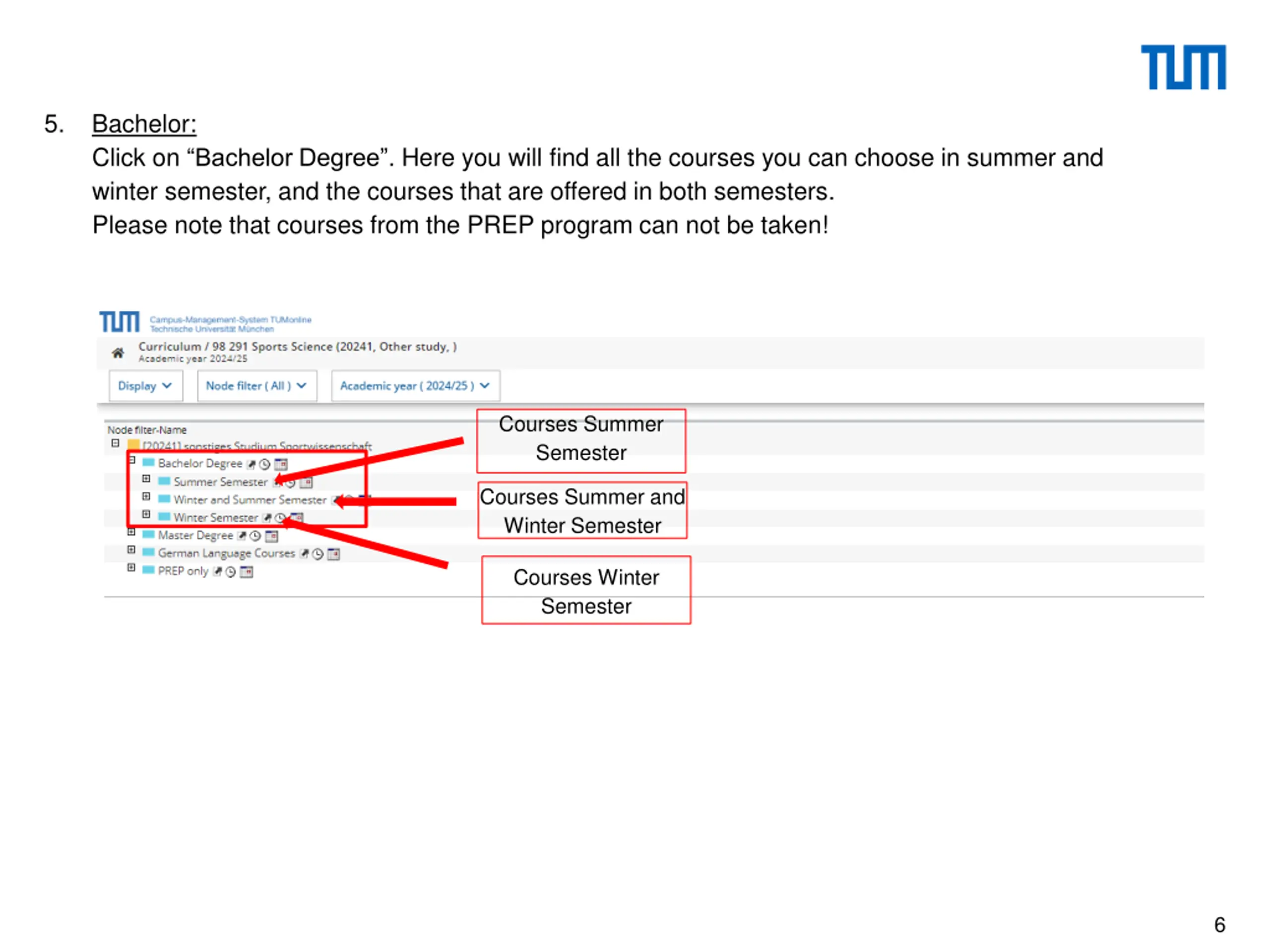 5. Bachelor: Click on Bachelor Degree . Here you will find all the courses you can choose in summer and winter semester, and the courses that are offered in both semesters. Please note that courses from the PREP program can not be taken! Courses Summer Semester Courses Summer and Winter Semester Courses Winter Semester 6
