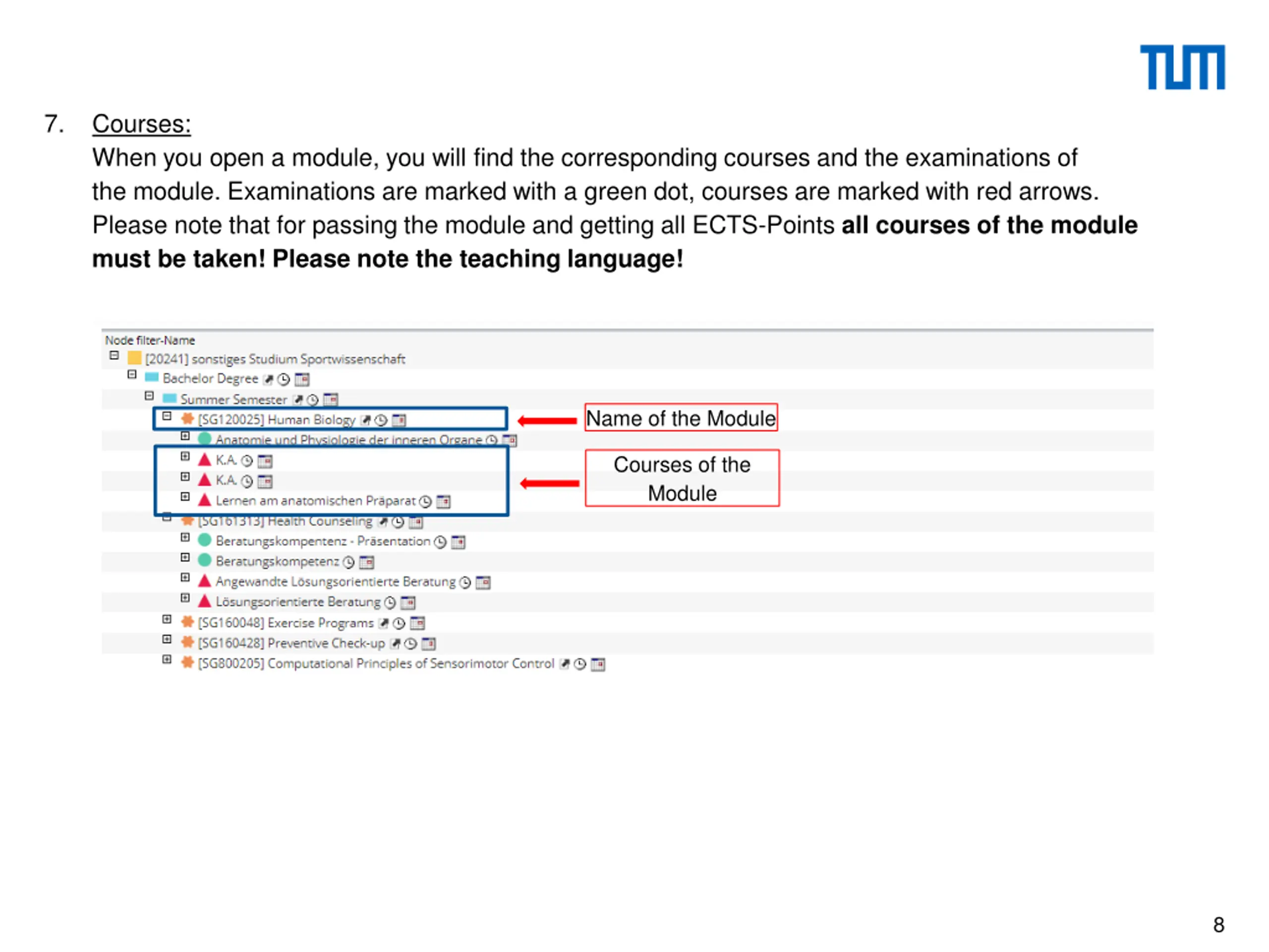 7. Courses: When you open a module, you will find the corresponding courses and the examinations of the module. Examinations are marked with a green dot, courses are marked with red arrows. Please note that for passing the module and getting all ECTS-Points all courses of the module must be taken! Please note the teaching language! Name of the Module Courses of the Module 8