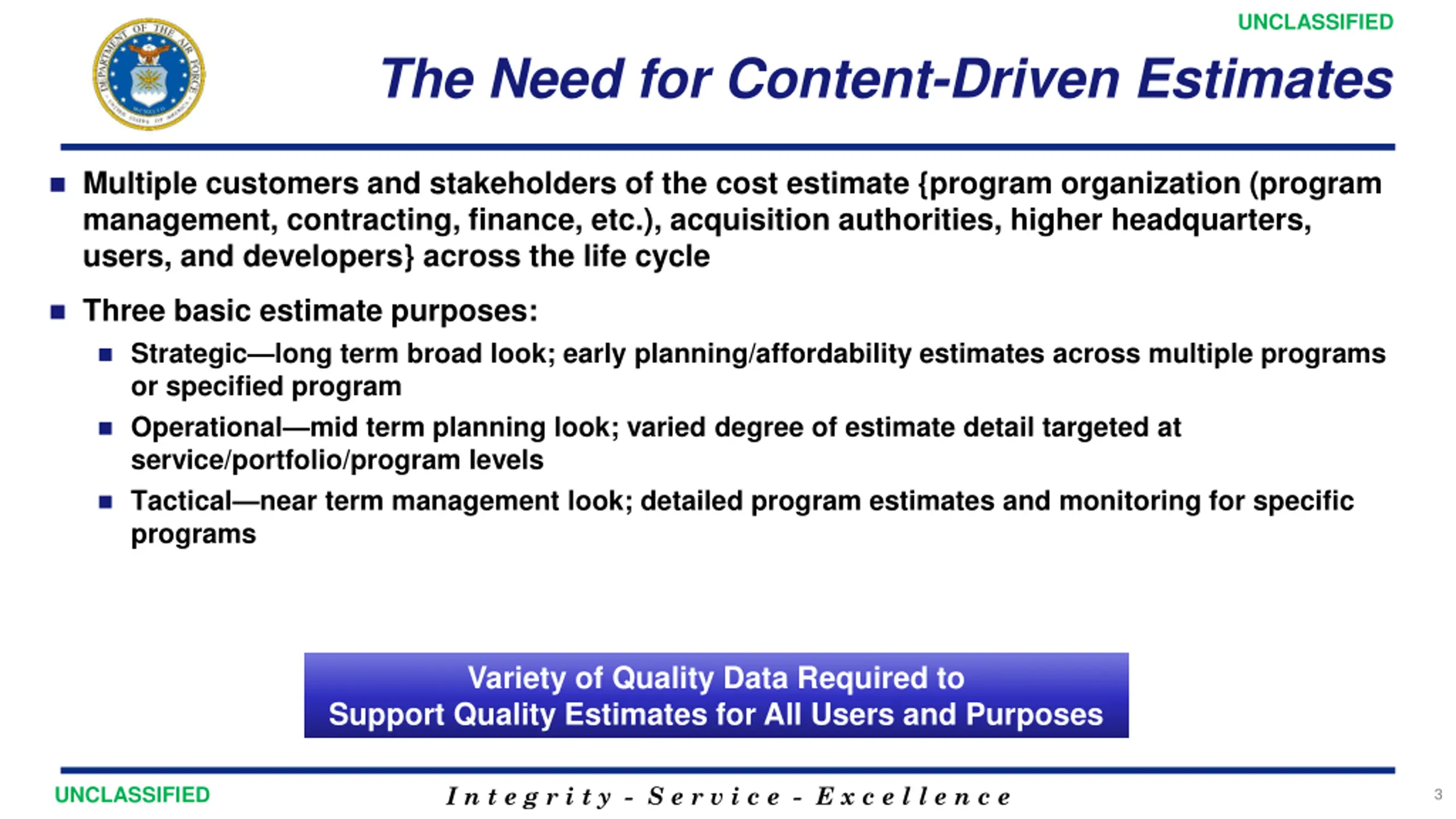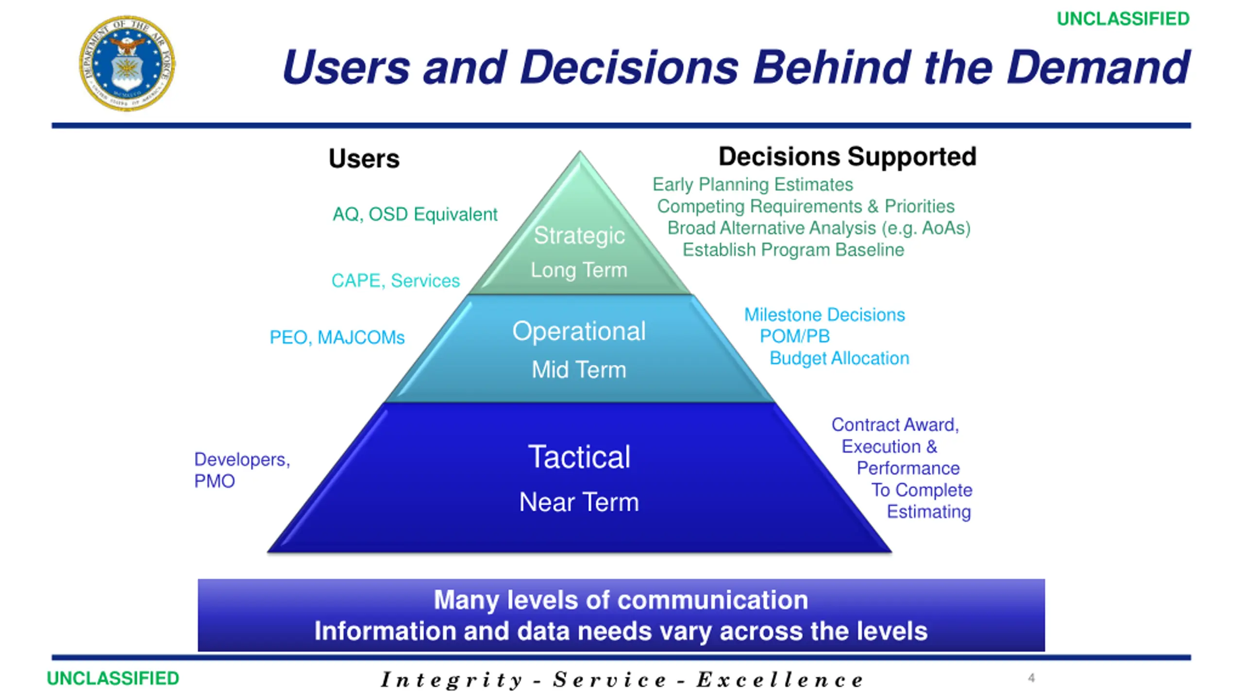 UNCLASSIFIED The Need for Content-Driven Estimates Multiple customers and stakeholders of the cost estimate {program organization (program management, contracting, finance, etc.), acquisition authorities, higher headquarters, users, and developers} across the life cycle Three basic estimate purposes: Strategic long term broad look; early planning/affordability estimates across multiple programs or specified program Operational mid term planning look; varied degree of estimate detail targeted at service/portfolio/program levels Tactical near term management look; detailed program estimates and monitoring for specific programs Variety of Quality Data Required to Support Quality Estimates for All Users and Purposes I n t e g r i t y - S e r v i c e - E x c e l l e n c e UNCLASSIFIED 3
