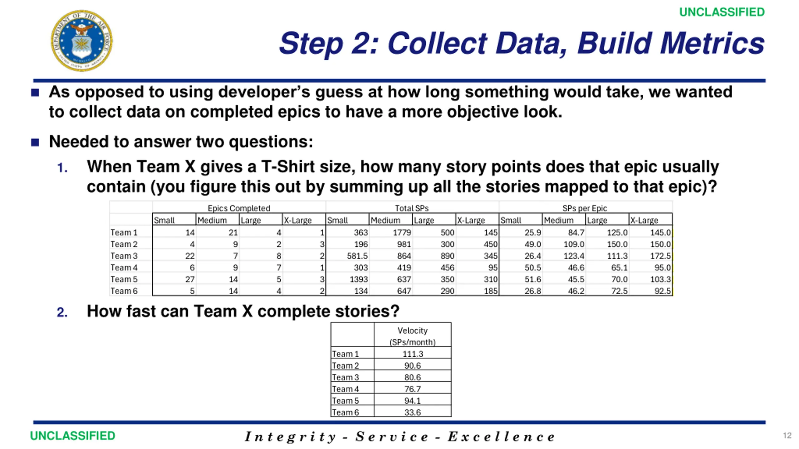 UNCLASSIFIED Step 2: Collect Data, Build Metrics As opposed to using developer s guess at how long something would take, we wanted to collect data on completed epics to have a more objective look. Needed to answer two questions: When Team X gives a T-Shirt size, how many story points does that epic usually contain (you figure this out by summing up all the stories mapped to that epic)? 1. Epics Completed Total SPs SPs per Epic Small Medium Large X-Large Small Medium Large X-Large Small Medium Large X-Large Team 1 Team 2 Team 3 Team 4 Team 5 Team 6 14 4 22 6 27 5 21 9 7 9 14 14 4 2 8 7 5 4 1 3 2 1 3 2 363 196 1779 981 864 419 637 647 500 300 890 456 350 290 145 450 345 95 310 185 25.9 49.0 26.4 50.5 51.6 26.8 84.7 109.0 123.4 46.6 45.5 46.2 125.0 150.0 111.3 65.1 70.0 72.5 145.0 150.0 172.5 95.0 103.3 92.5 581.5 303 1393 134 How fast can Team X complete stories? 2. Velocity (SPs/month) 111.3 90.6 80.6 76.7 94.1 33.6 Team 1 Team 2 Team 3 Team 4 Team 5 Team 6 I n t e g r i t y - S e r v i c e - E x c e l l e n c e UNCLASSIFIED 12