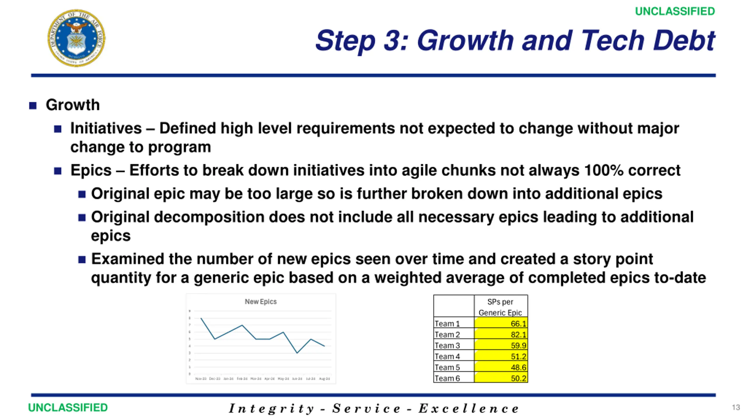 UNCLASSIFIED Step 3: Growth and Tech Debt Growth Initiatives Defined high level requirements not expected to change without major change to program Epics Efforts to break down initiatives into agile chunks not always 100% correct Original epic may be too large so is further broken down into additional epics Original decomposition does not include all necessary epics leading to additional epics Examined the number of new epics seen over time and created a story point quantity for a generic epic based on a weighted average of completed epics to-date SPs per Generic Epic New Epics New Epics 9 8 Team 1 Team 2 Team 3 Team 4 Team 5 Team 6 66.1 82.1 59.9 51.2 48.6 50.2 7 6 5 4 3 2 1 0 Nov-23 Dec-23 Jan-24 Feb-24 Mar-24 Apr-24 May-24 Jun-24 Jul-24 Aug-24 I n t e g r i t y - S e r v i c e - E x c e l l e n c e UNCLASSIFIED 13