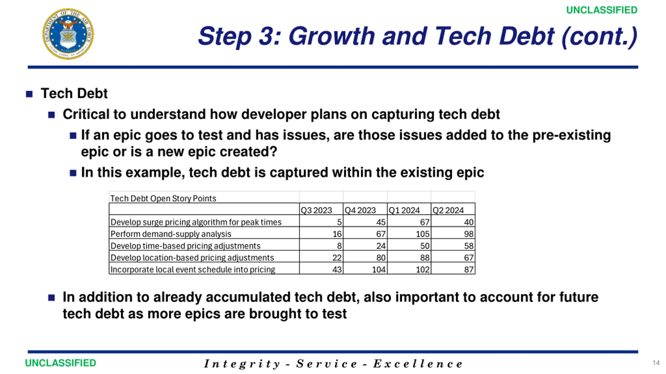 UNCLASSIFIED Step 3: Growth and Tech Debt (cont.) Tech Debt Critical to understand how developer plans on capturing tech debt If an epic goes to test and has issues, are those issues added to the pre-existing epic or is a new epic created? In this example, tech debt is captured within the existing epic Tech Debt Open Story Points Q3 2023 Q4 2023 Q1 2024 Q2 2024 Develop surge pricing algorithm for peak times Perform demand-supply analysis Develop time-based pricing adjustments Develop location-based pricing adjustments Incorporate local event schedule into pricing 5 45 67 24 80 104 67 105 50 88 102 40 98 58 67 87 16 8 22 43 In addition to already accumulated tech debt, also important to account for future tech debt as more epics are brought to test I n t e g r i t y - S e r v i c e - E x c e l l e n c e UNCLASSIFIED 14