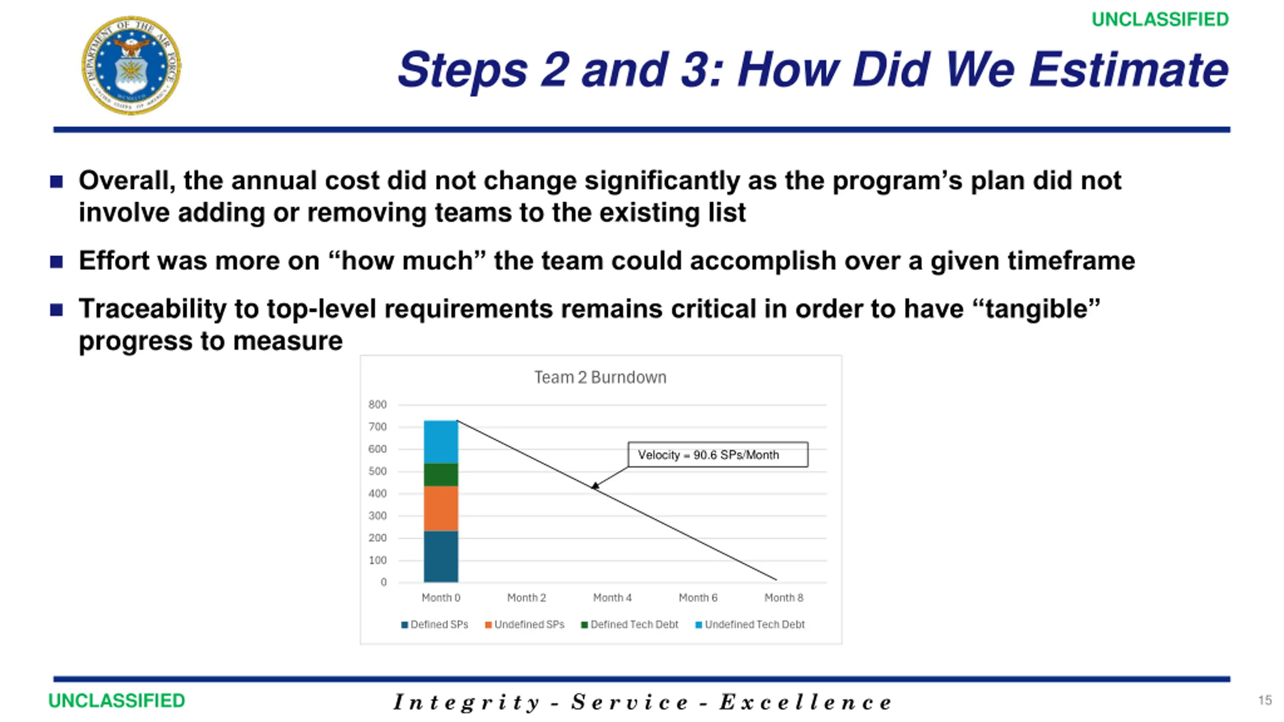 UNCLASSIFIED Steps 2 and 3: How Did We Estimate Overall, the annual cost did not change significantly as the program s plan did not involve adding or removing teams to the existing list Effort was more on how much the team could accomplish over a given timeframe Traceability to top-level requirements remains critical in order to have tangible progress to measure Team 2 Burndown 800 700 600 Velocity = 90.6 SPs/Month 500 400 300 200 100 0 Month 0 Month 2 Month 4 Month 6 Month 8 Defined SPs Undefined SPs Defined Tech Debt Undefined Tech Debt I n t e g r i t y - S e r v i c e - E x c e l l e n c e UNCLASSIFIED 15