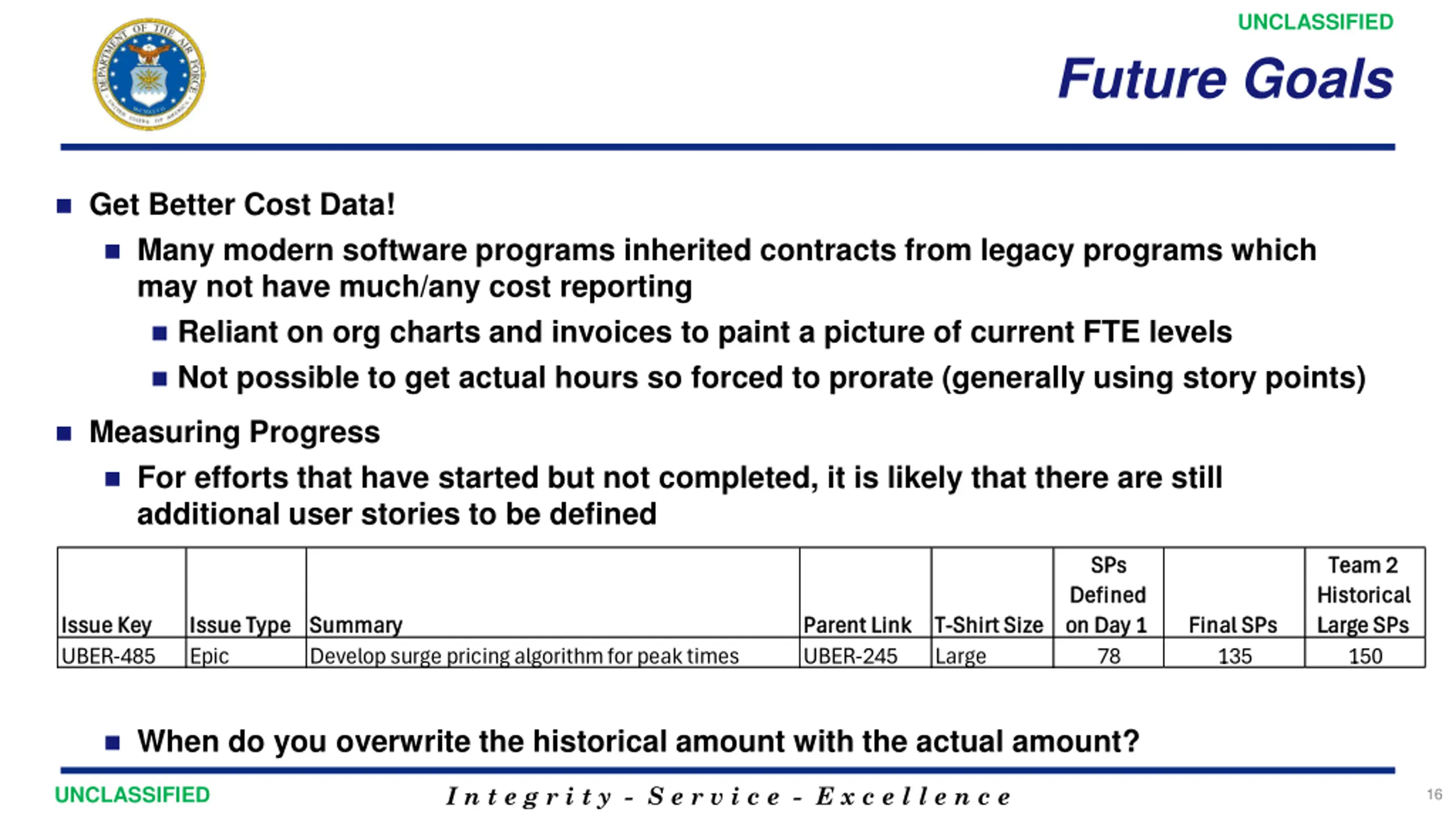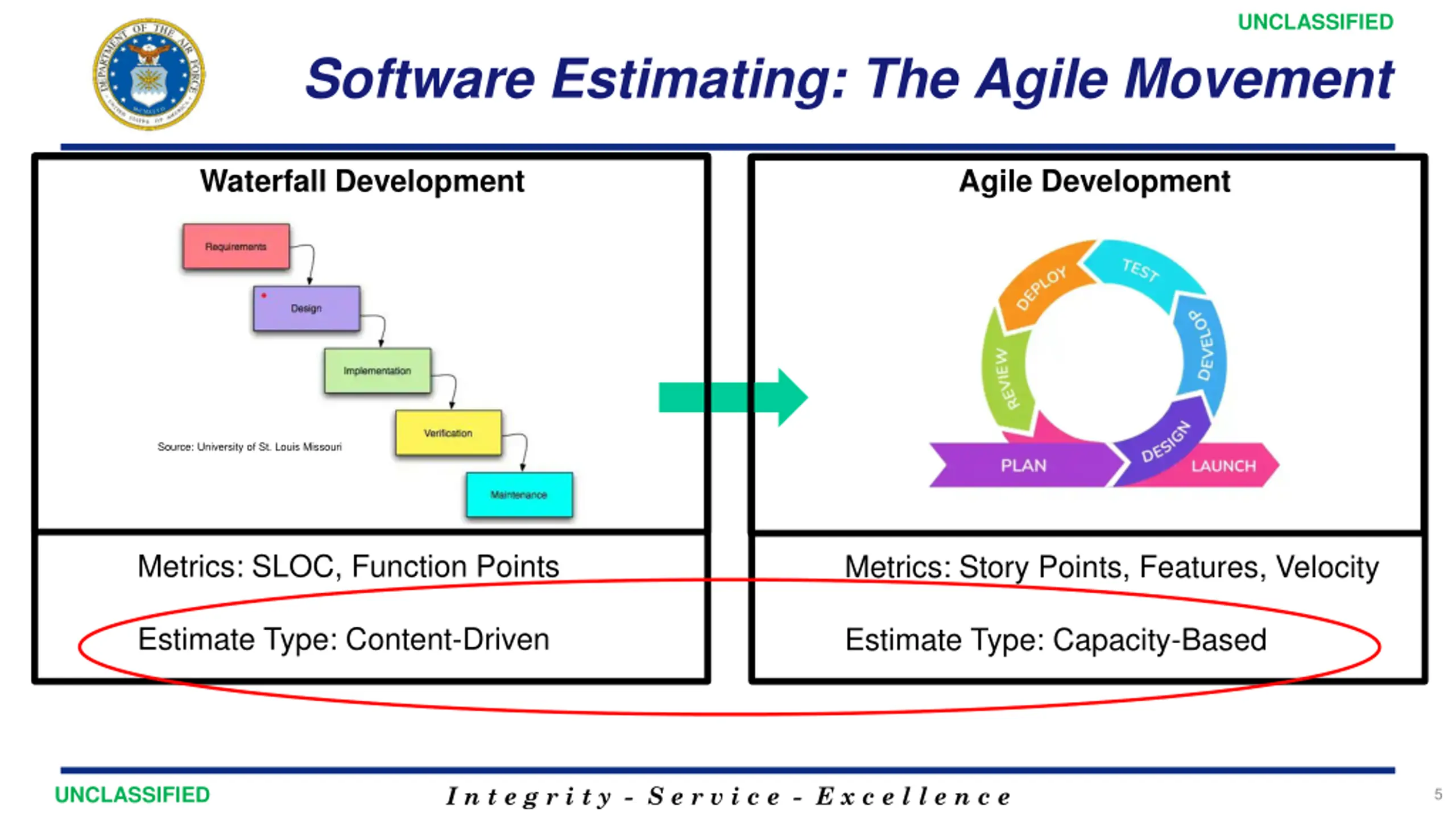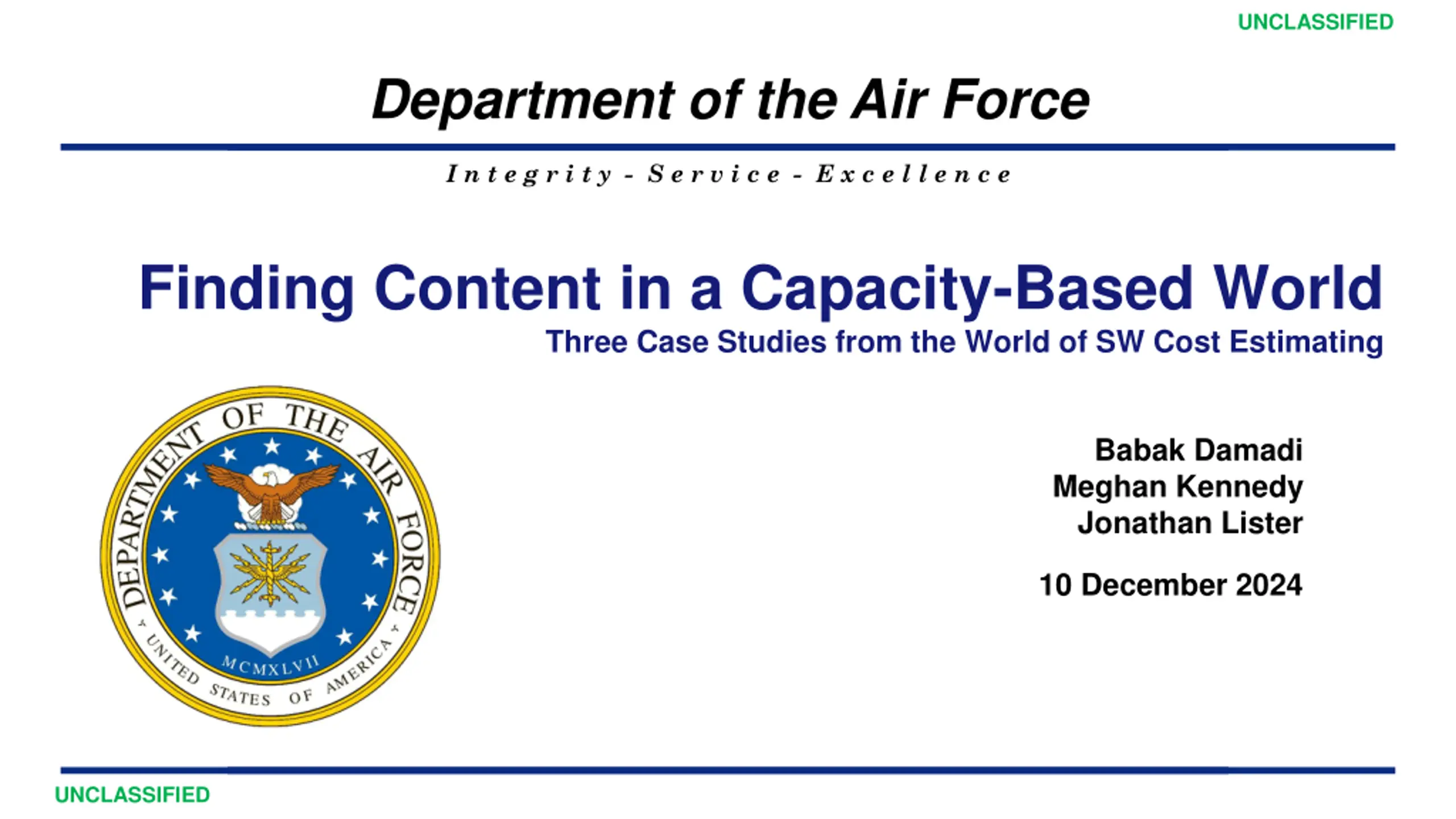 UNCLASSIFIED Department of the Air Force I n t e g r i t y - S e r v i c e - E x c e l l e n c e Finding Content in a Capacity-Based World Three Case Studies from the World of SW Cost Estimating Babak Damadi Meghan Kennedy Jonathan Lister 10 December 2024 UNCLASSIFIED