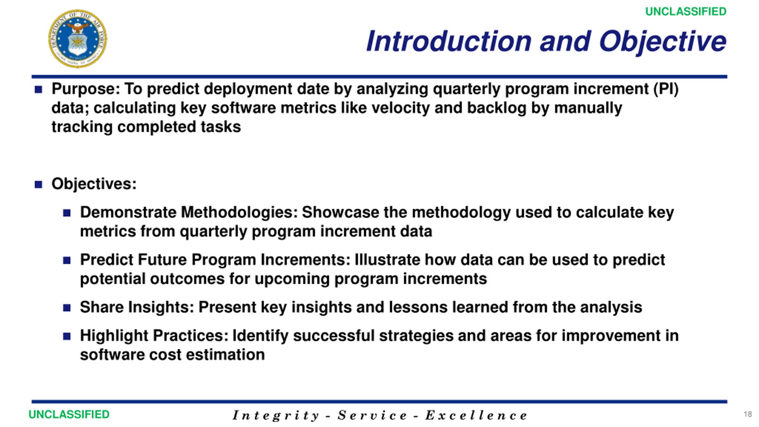 UNCLASSIFIED Introduction and Objective Purpose: To predict deployment date by analyzing quarterly program increment (PI) data; calculating key software metrics like velocity and backlog by manually tracking completed tasks Objectives: Demonstrate Methodologies: Showcase the methodology used to calculate key metrics from quarterly program increment data Predict Future Program Increments: Illustrate how data can be used to predict potential outcomes for upcoming program increments Share Insights: Present key insights and lessons learned from the analysis Highlight Practices: Identify successful strategies and areas for improvement in software cost estimation I n t e g r i t y - S e r v i c e - E x c e l l e n c e UNCLASSIFIED 18