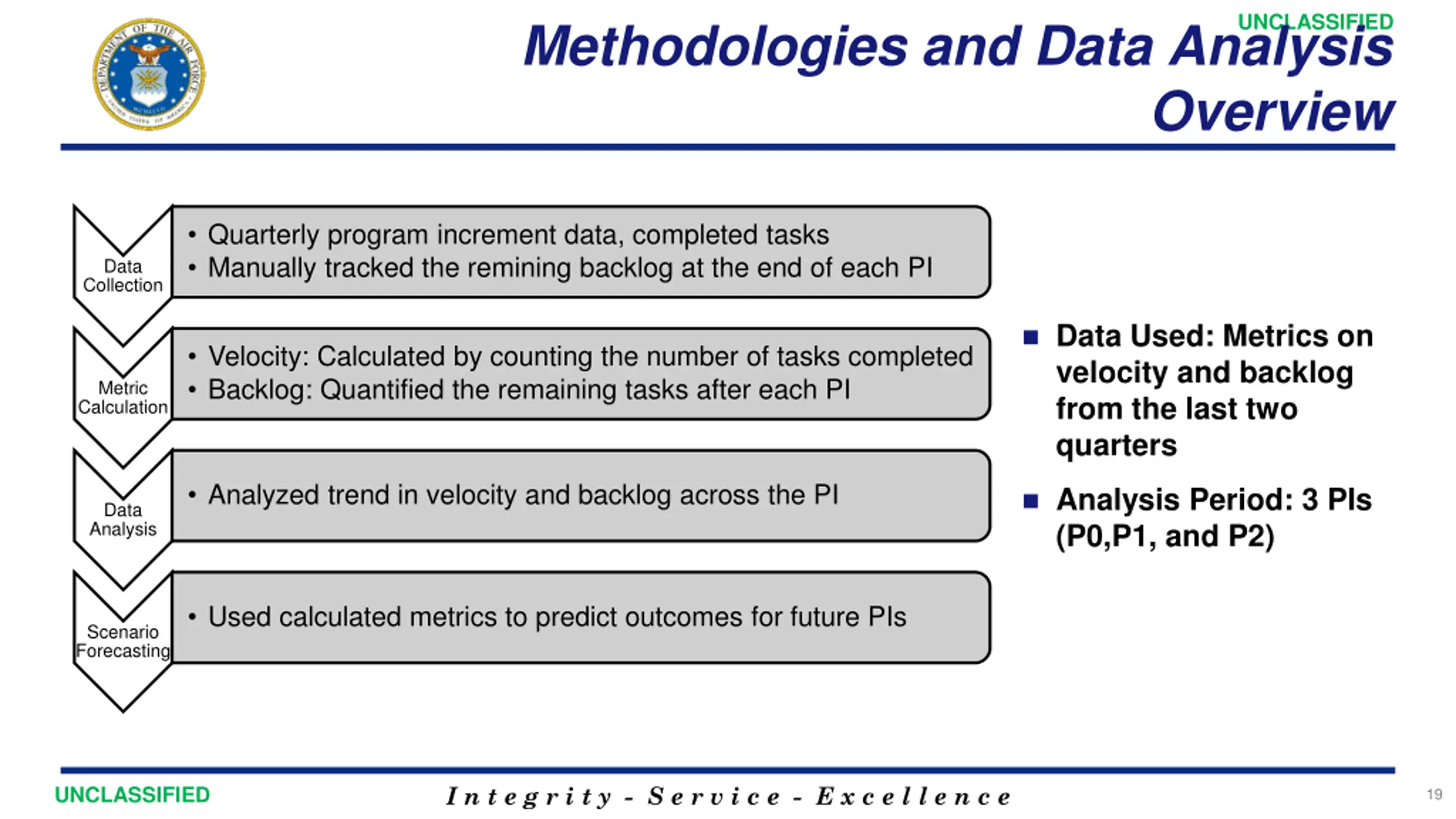 UNCLASSIFIED Methodologies and Data Analysis Overview Quarterly program increment data, completed tasks Manually tracked the remining backlog at the end of each PI Data Collection Data Used: Metrics on velocity and backlog from the last two quarters Velocity: Calculated by counting the number of tasks completed Backlog: Quantified the remaining tasks after each PI Metric Calculation Analyzed trend in velocity and backlog across the PI Analysis Period: 3 PIs (P0,P1, and P2) Data Analysis Used calculated metrics to predict outcomes for future PIs Scenario Forecasting I n t e g r i t y - S e r v i c e - E x c e l l e n c e UNCLASSIFIED 19