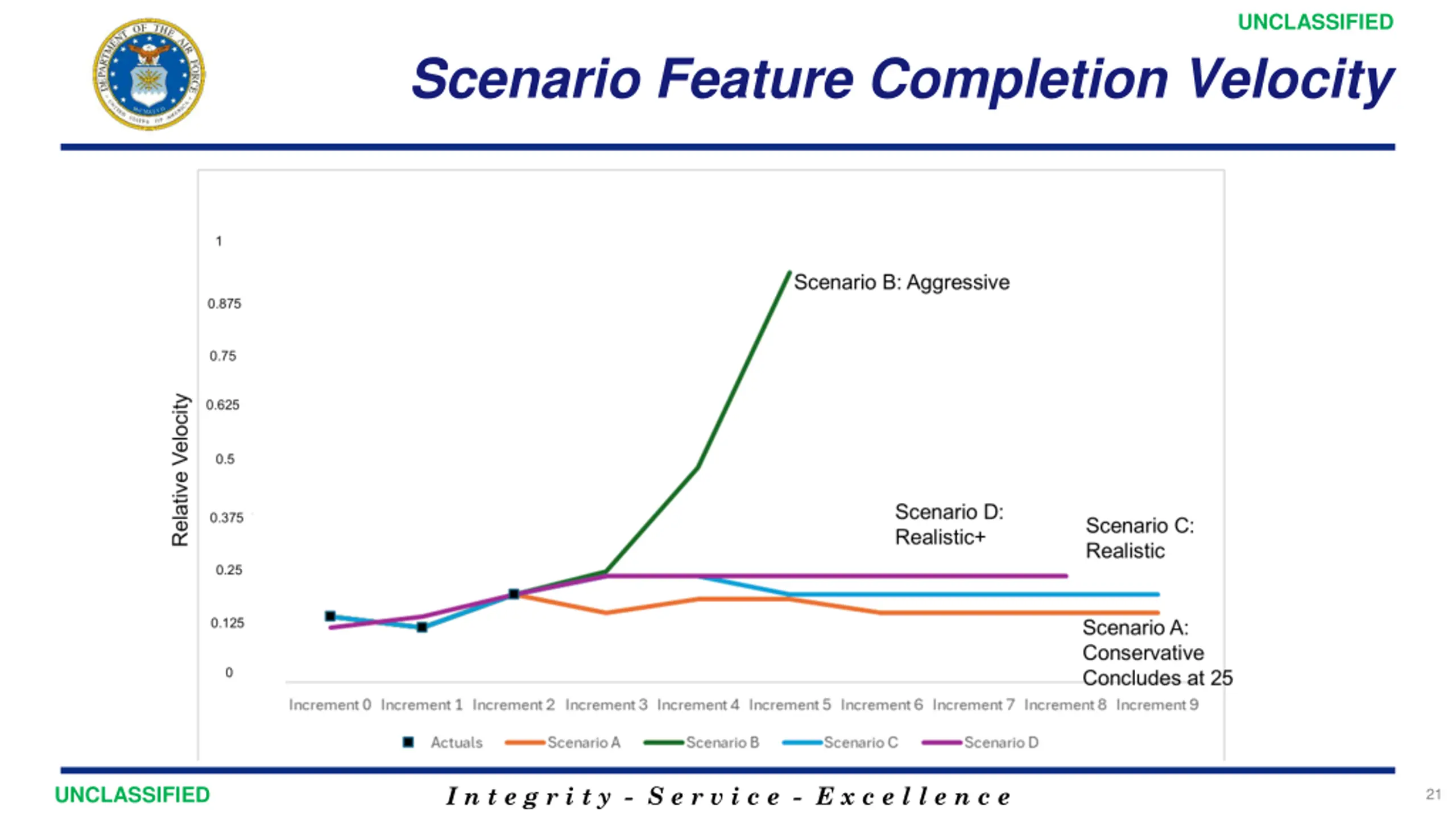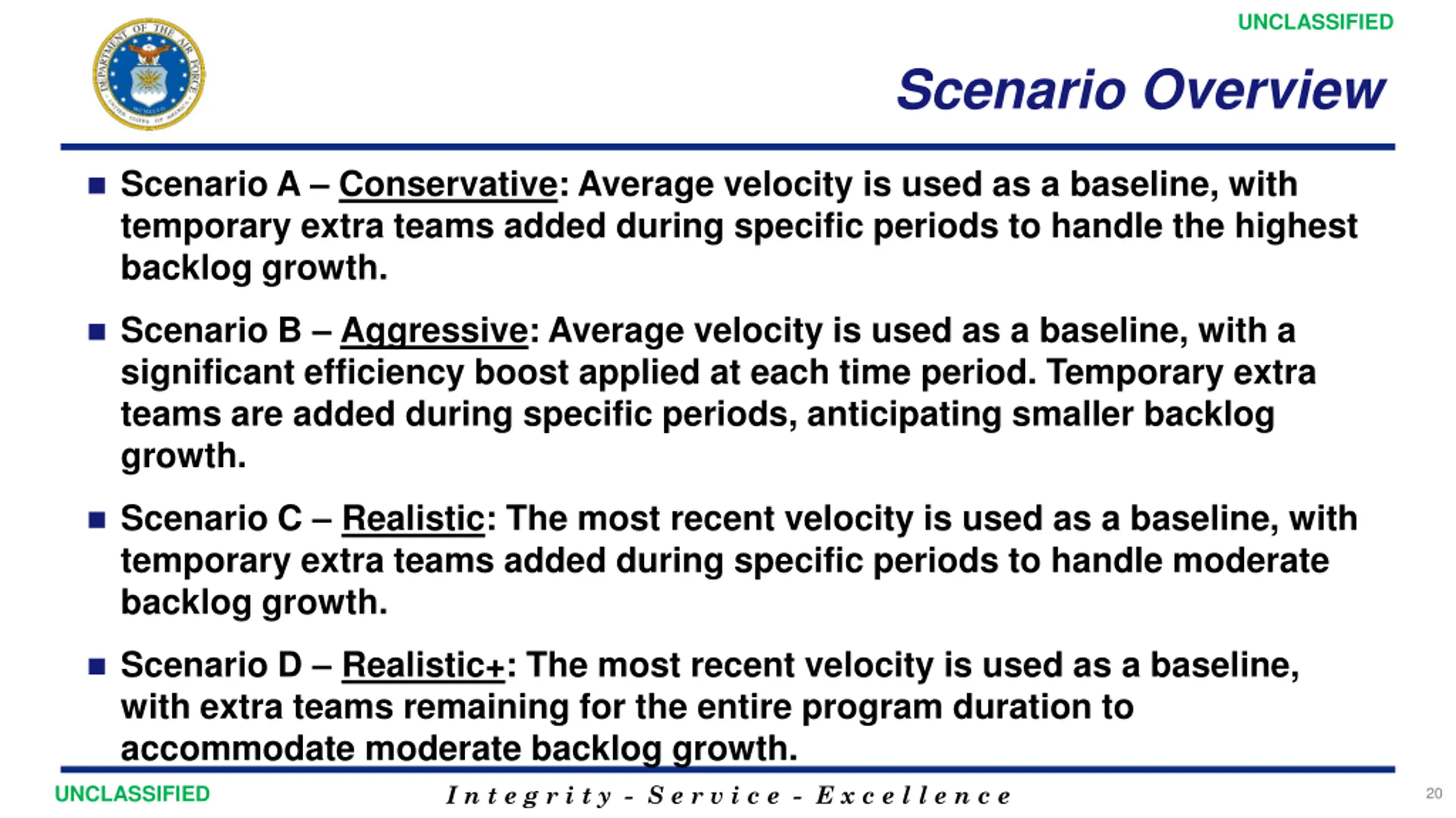 UNCLASSIFIED Scenario Overview Scenario A Conservative: Average velocity is used as a baseline, with temporary extra teams added during specific periods to handle the highest backlog growth. Scenario B Aggressive: Average velocity is used as a baseline, with a significant efficiency boost applied at each time period. Temporary extra teams are added during specific periods, anticipating smaller backlog growth. Scenario C Realistic: The most recent velocity is used as a baseline, with temporary extra teams added during specific periods to handle moderate backlog growth. Scenario D Realistic+: The most recent velocity is used as a baseline, with extra teams remaining for the entire program duration to accommodate moderate backlog growth. I n t e g r i t y - S e r v i c e - E x c e l l e n c e UNCLASSIFIED 20